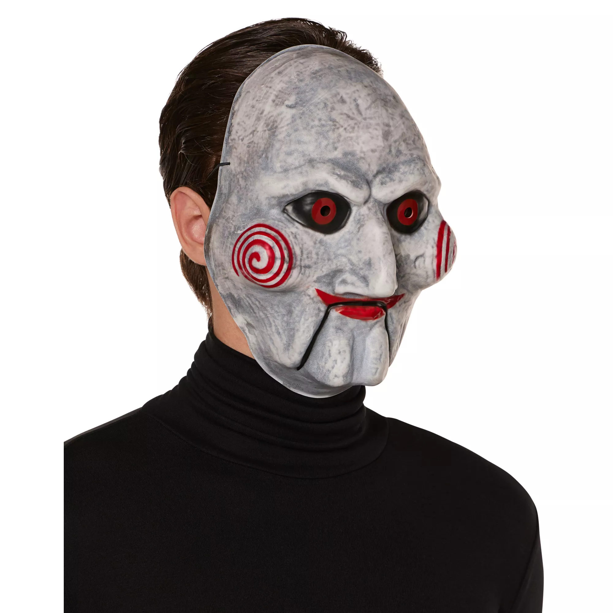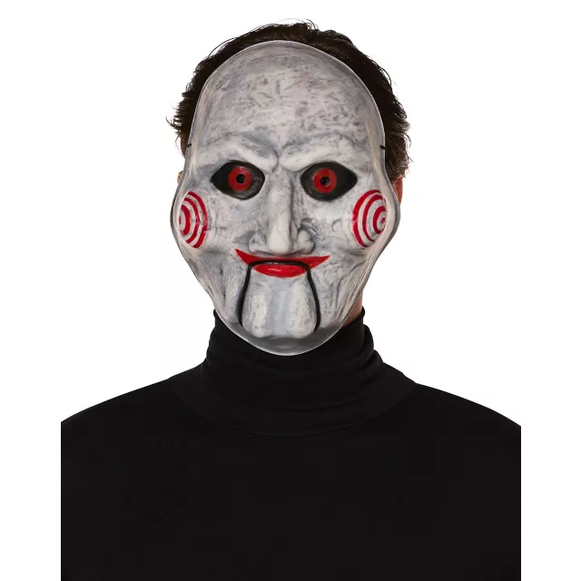 Are you ready to play games with people? Finish off your Saw-inspired costume with the officially licensed Billy mask! With beady red eyes, spiral cheeks, and a disturbing smile, this mask is sure to terrifying anyone who's seen a Saw movie or two.