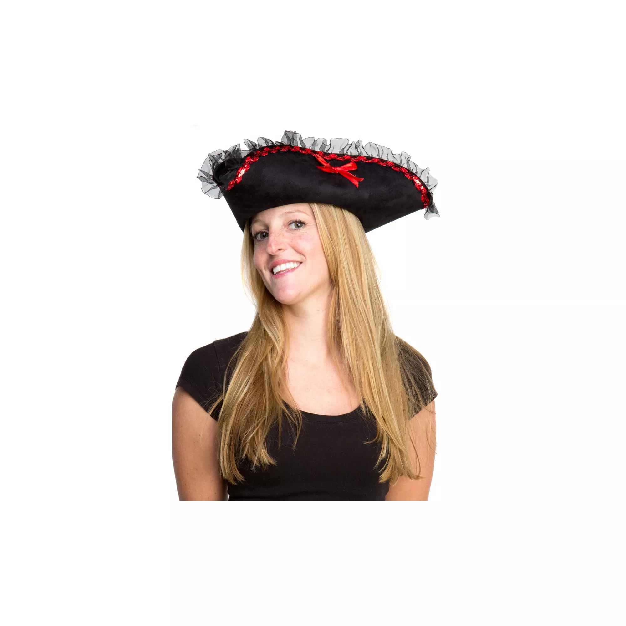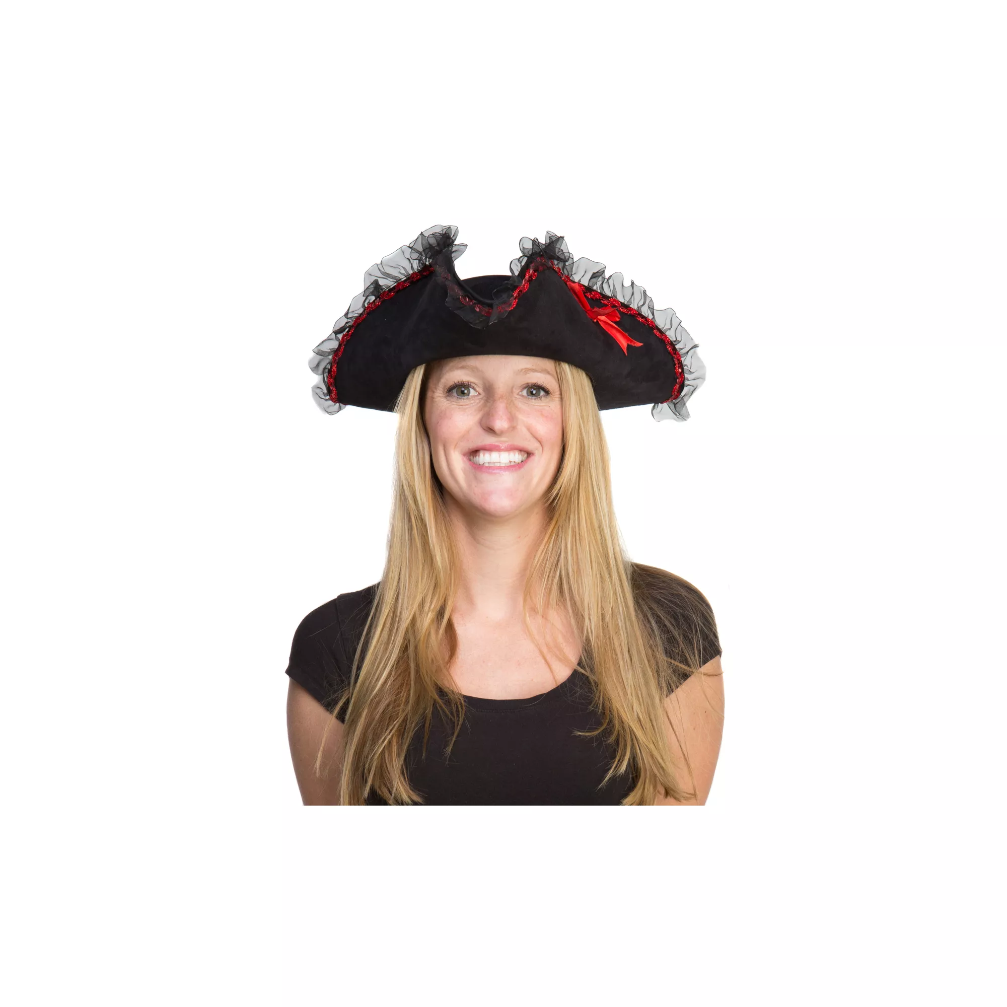 You'll never be a pirate without a hat! You'll certainly never be a captain! Make sure that's not the case when you wear this Pirate Black and Red Women's Hat complete with classic shape, ruffle detail and red ribbon and bow lining.