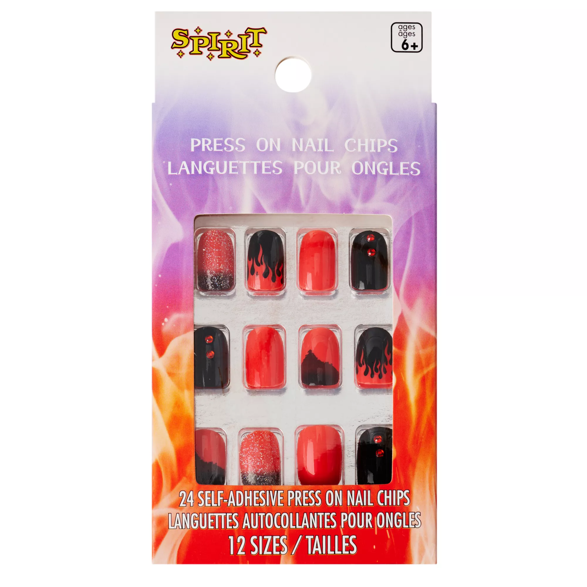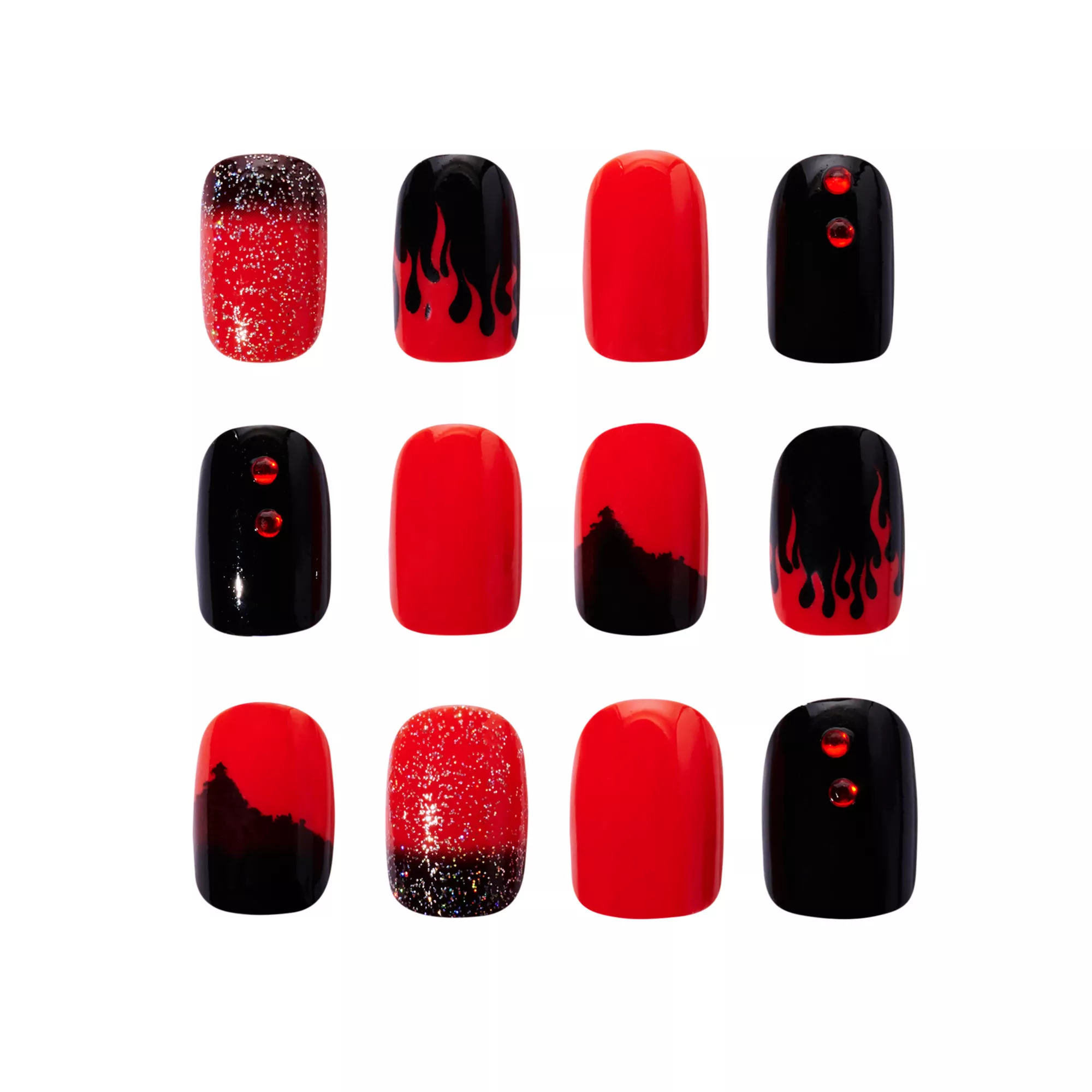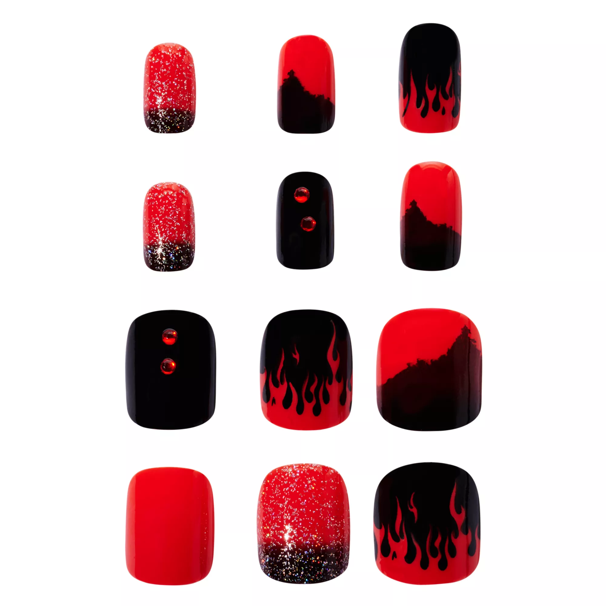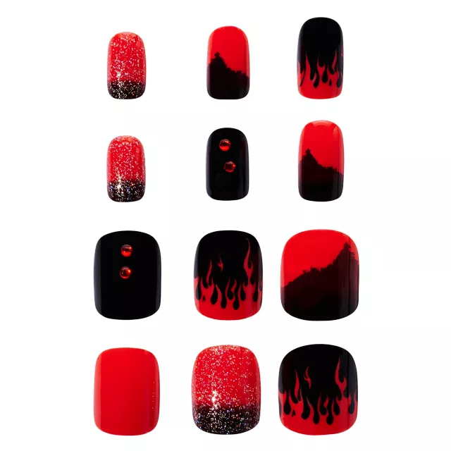 Give your nails a fiery flair with our Black and Red Press On Nails! This set features a variety of unique designs, including a shimmering ombre, red rhinestone decals, and flame-patterned nails.