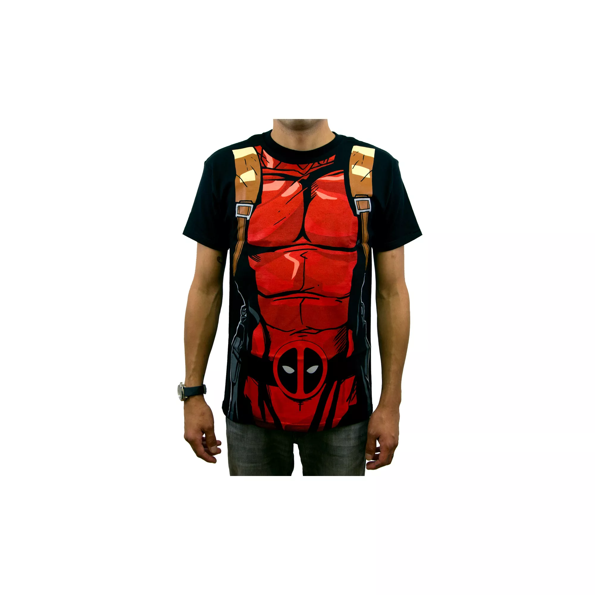 Stabilize your status among the other superheroes in the Officially Licensed Deadpool Adult Tee. This black tee has the red, muscular body of Deadpool.