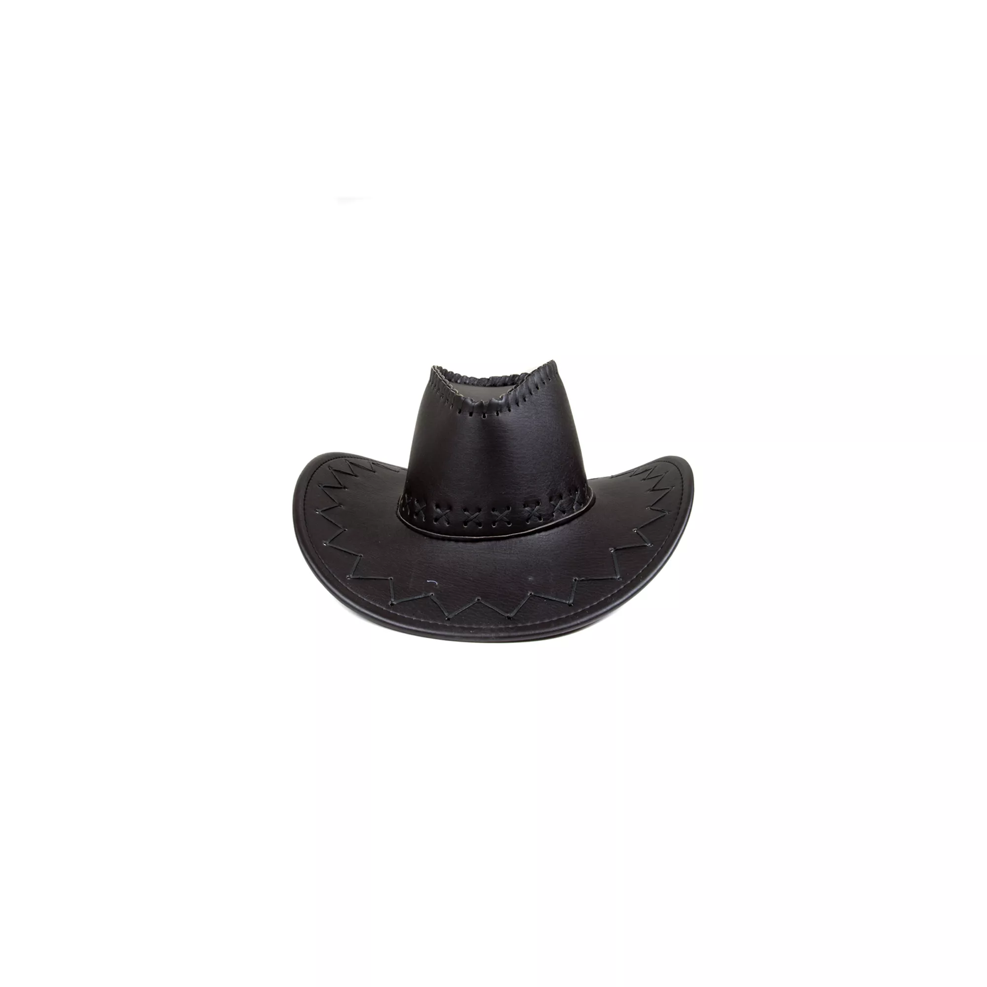 Top off you cowboy costume with this rigged black faux leather Cowboy hat completed with fancy stitching and lacing detail.