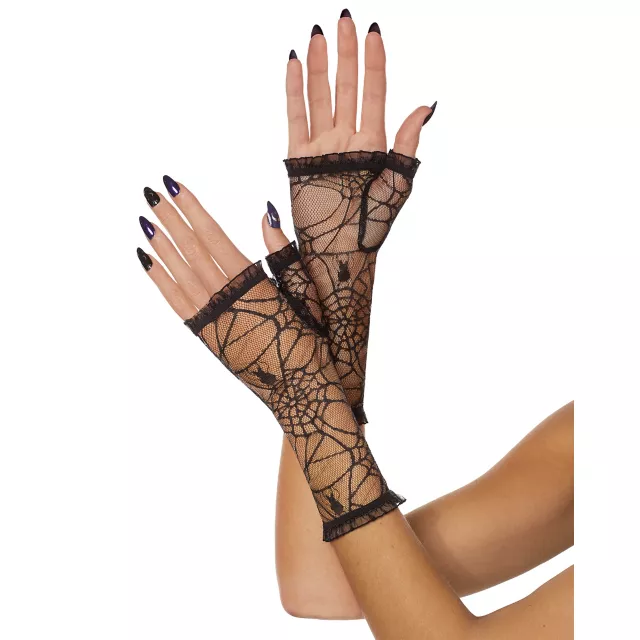 The Black Fingerless Spider Web Gloves add that spooky spark to any witch, vampire or dead bride costume. They feature fingerless openings and a ruffled trim detail.