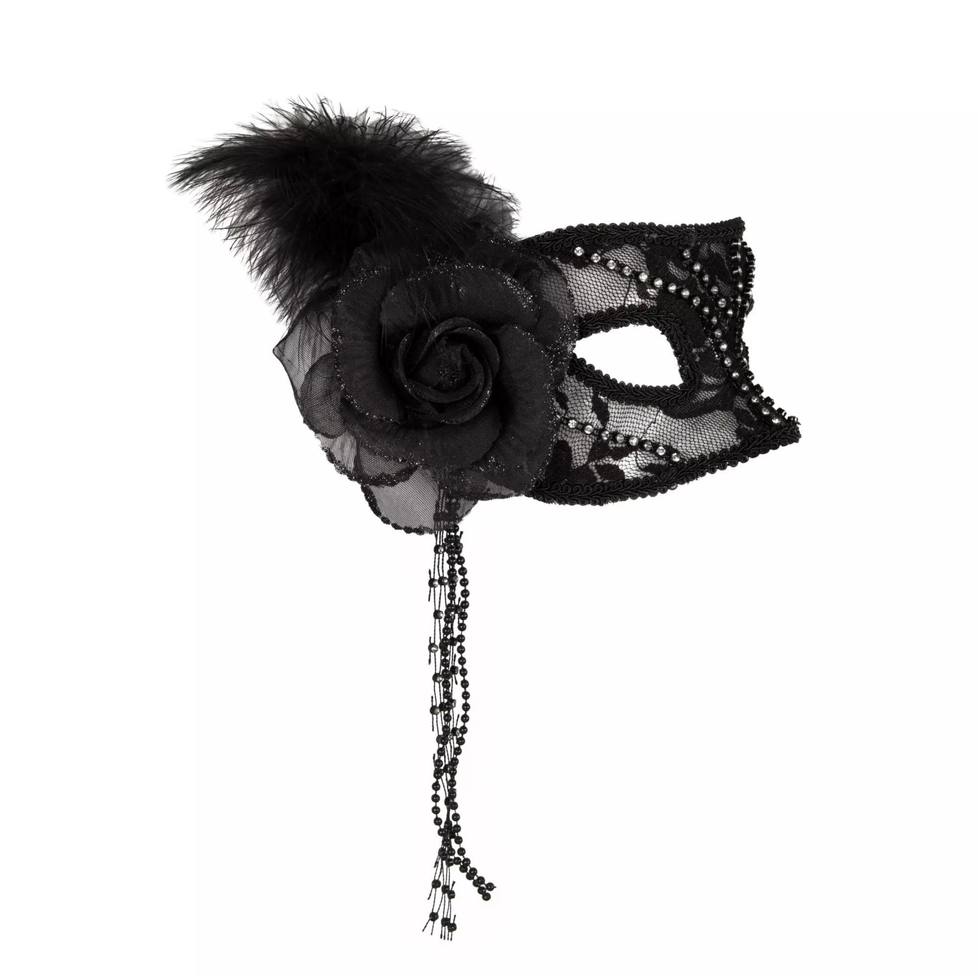 Become anonymous and intriguing by adding this Black Flower and Rhinestones Mask to any costume! This gorgeous mask features a black lace overlay, rhinestones swirled on the side and between the eyes, and a magnificent black rose on the side. The feather sprouting from the top of the rose and the beads dangling from it make it the perfect addition to a flapper or bird costume!