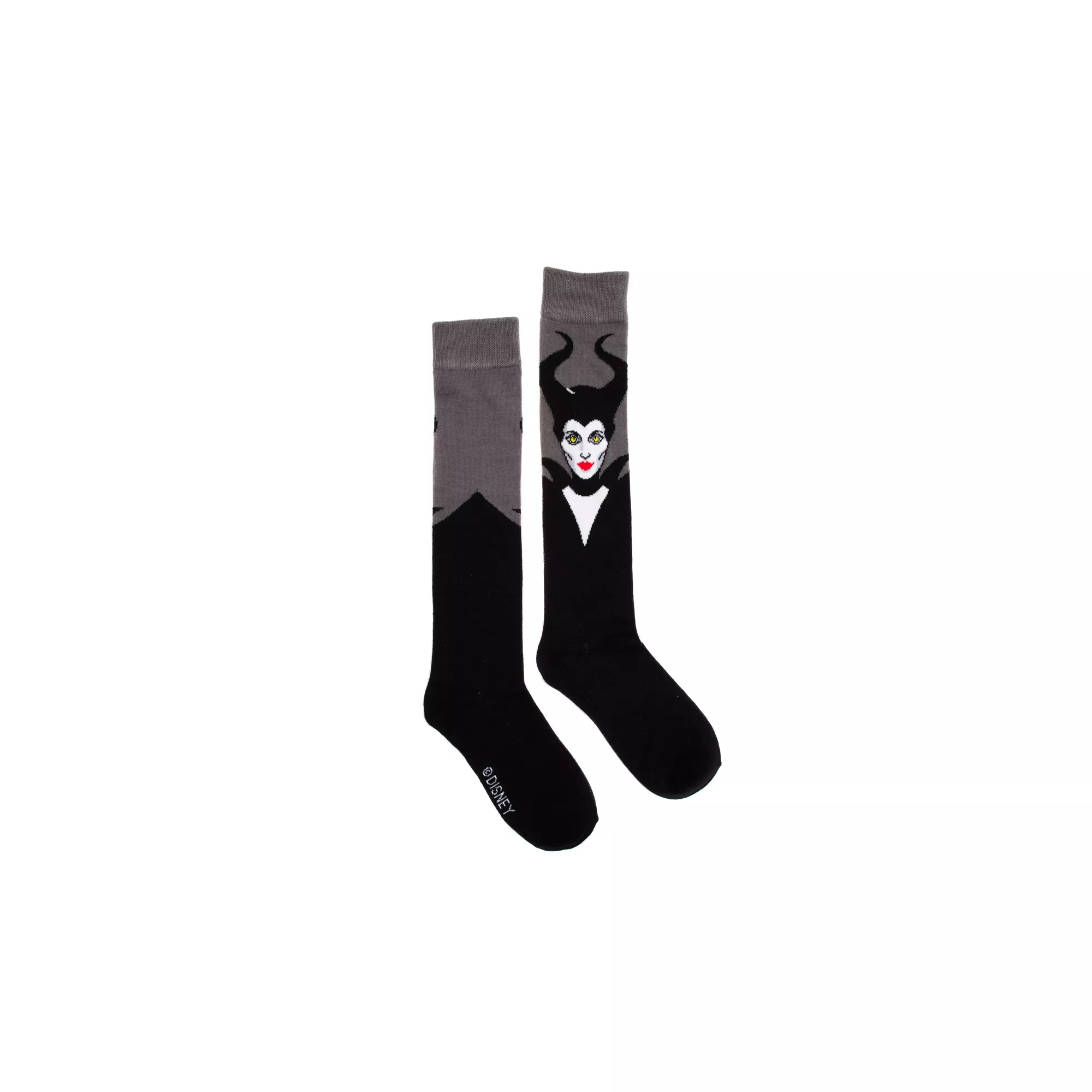 Infuse a bit of evil into your look this Halloween with the  Officially Licensed Maleficent Black Knee High Socks. These socks hit just below the knee and have a Maleficent graphic.