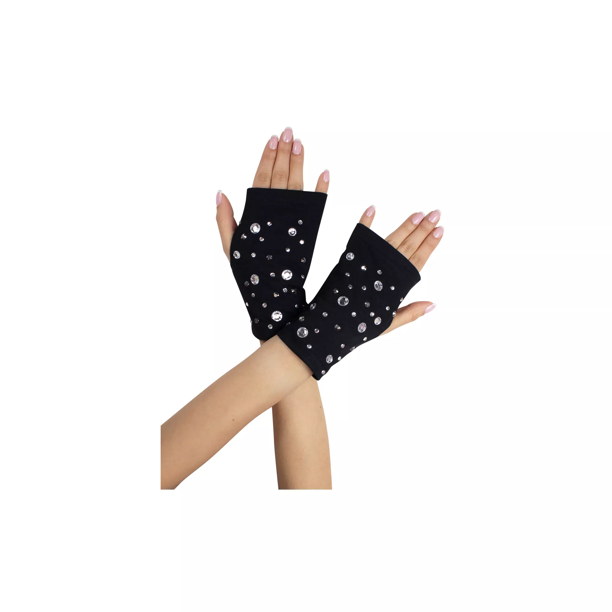 If you just want a bit of glitz and sparkle, add the Black Fingerless Rhinestone Gloves to your Halloween costume. Features short black gloves, with alternating sized gemstones.