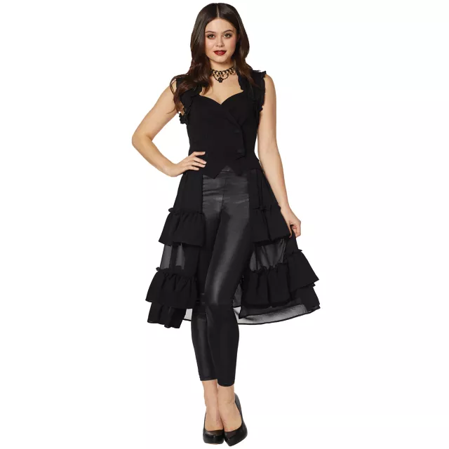 Add some ruffled glamour to any costume with this vest! This long black vest has convenient snap closure and is accented with beautiful ruffled detailing. Whether you’re an alluring vampire or a swashbuckling pirate, this ruffled vest will add some flair to any costume!