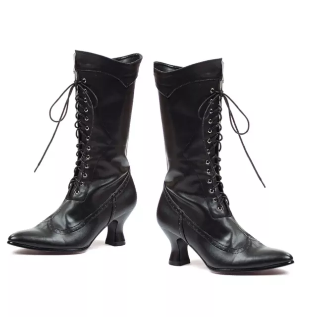 These black Victorian women's boots are wicked cool. Complete your witch, wench or wanton woman costume with these unique boots. The laces are decorative because the boots have an inner side zipper opening for easy wear. Perfect for a racy saloon girl look when worn with stockings and garters!