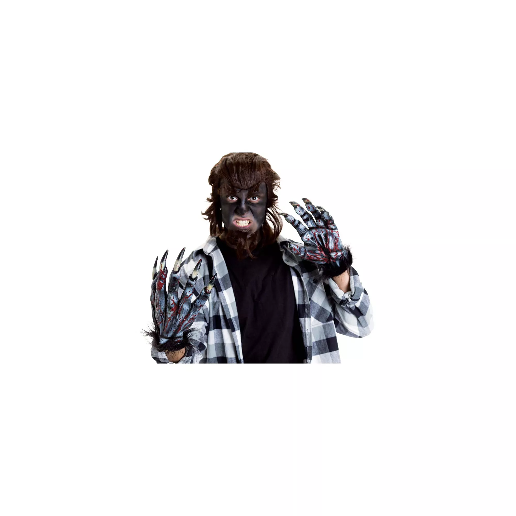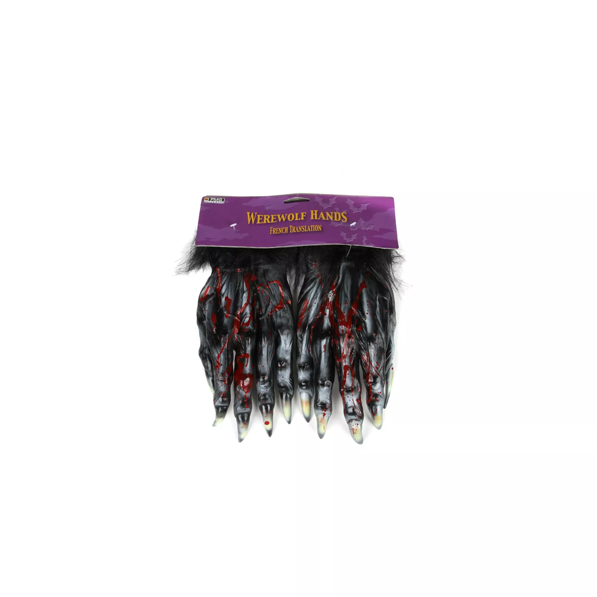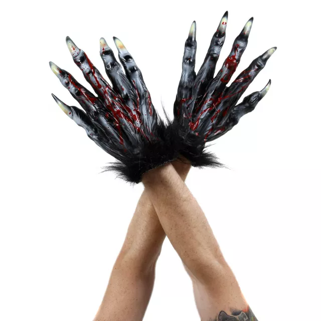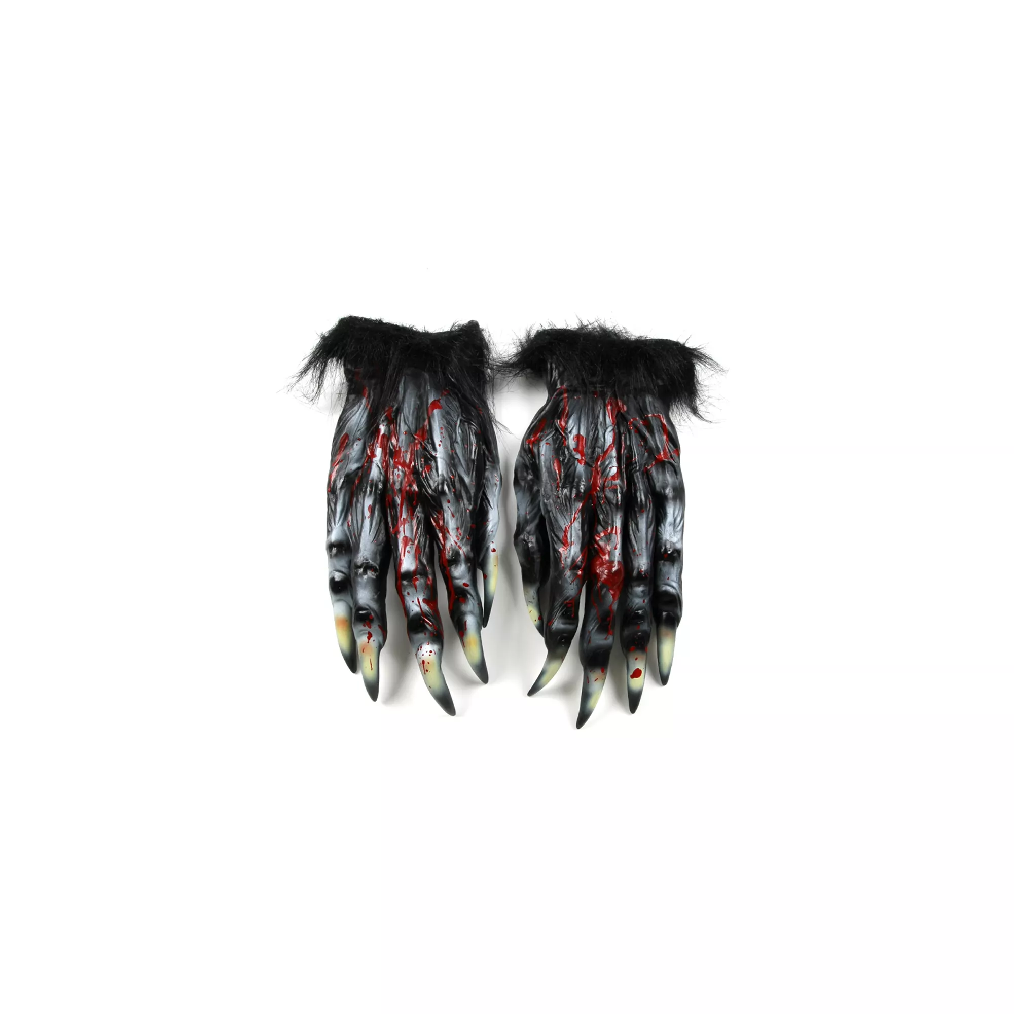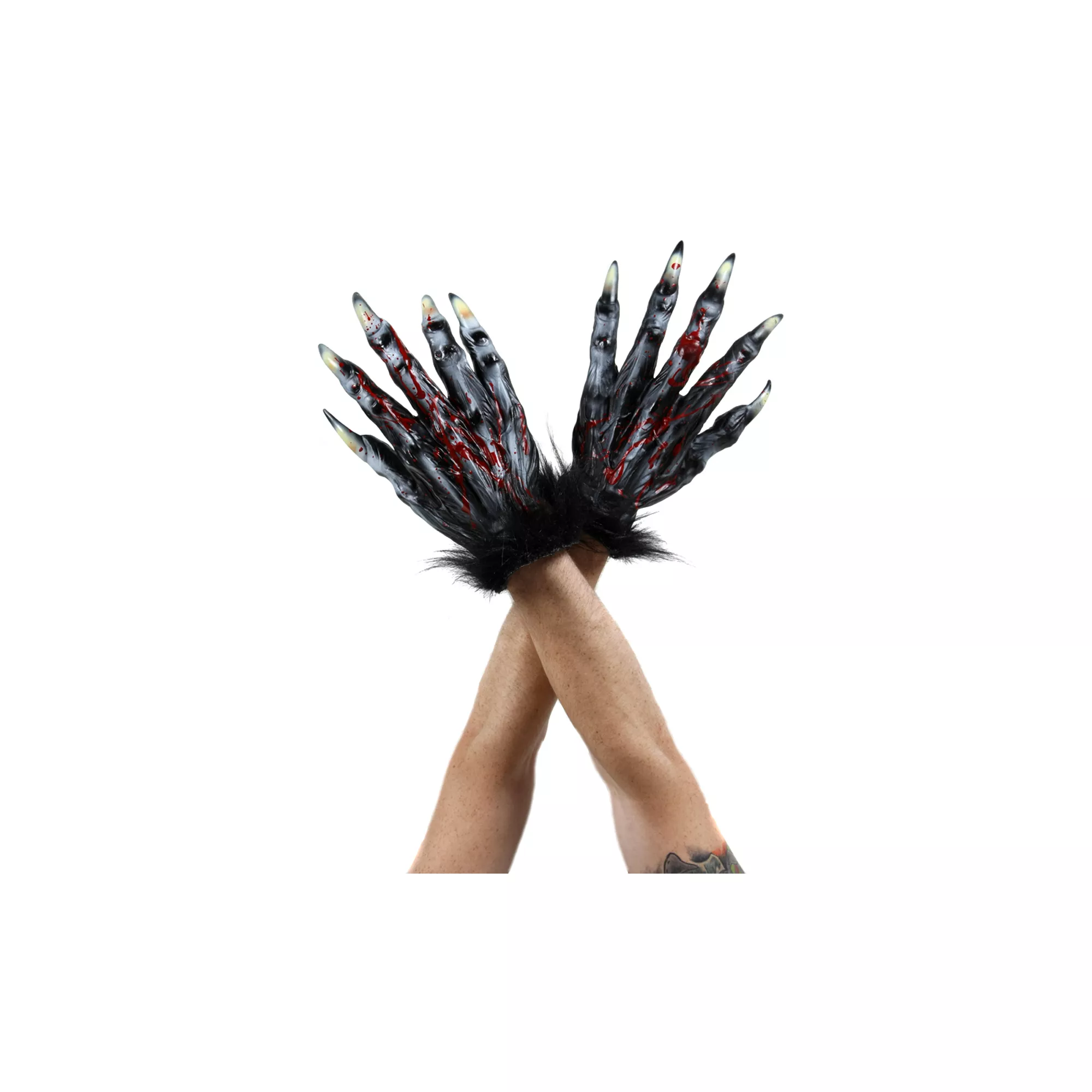 Transform yourself into a fearsome werewolf with these black and gray Werewolf Hands embellished with tufts of faux fur and blood streaks.