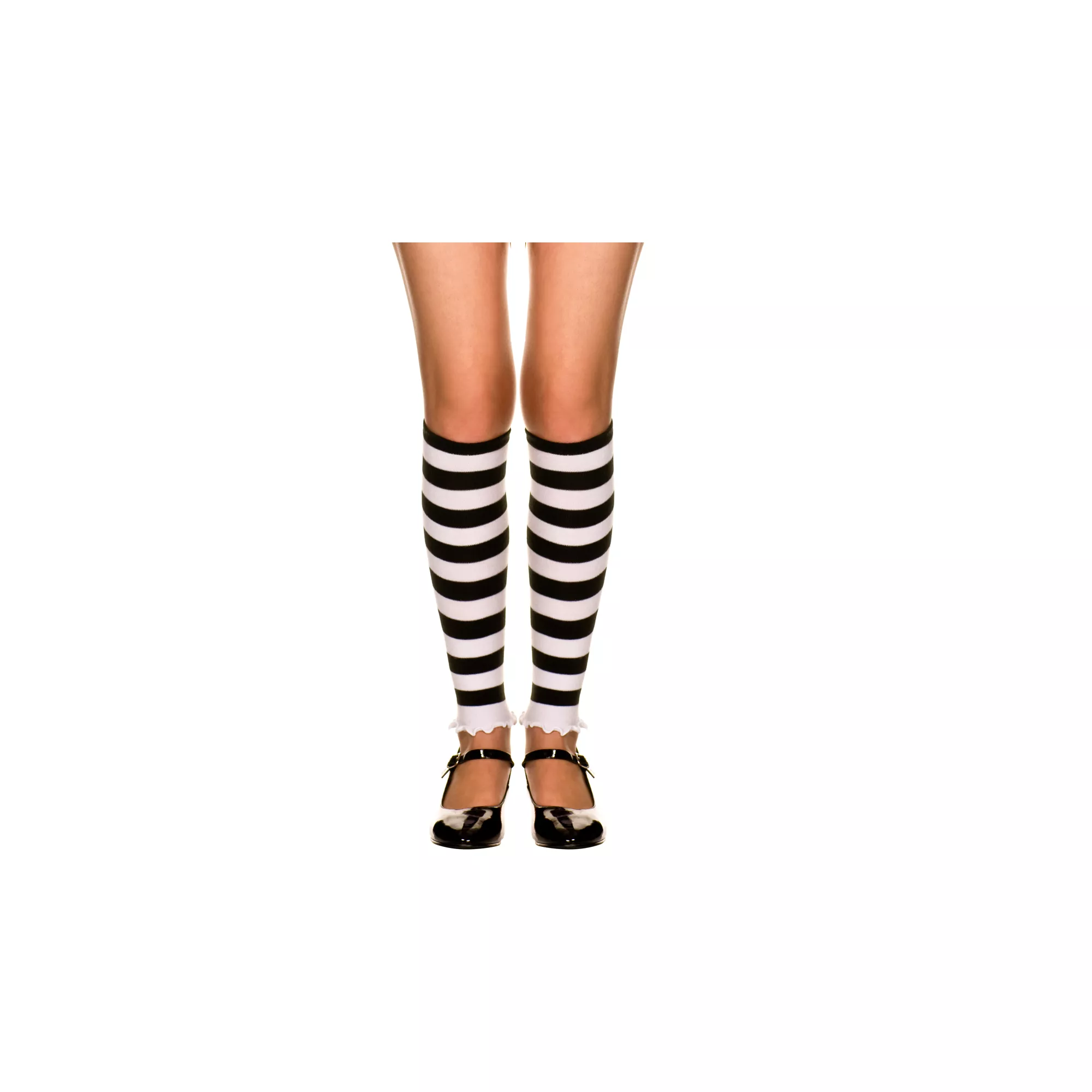 Create or complete your costume with these fun black and white striped girl's leg warmers.