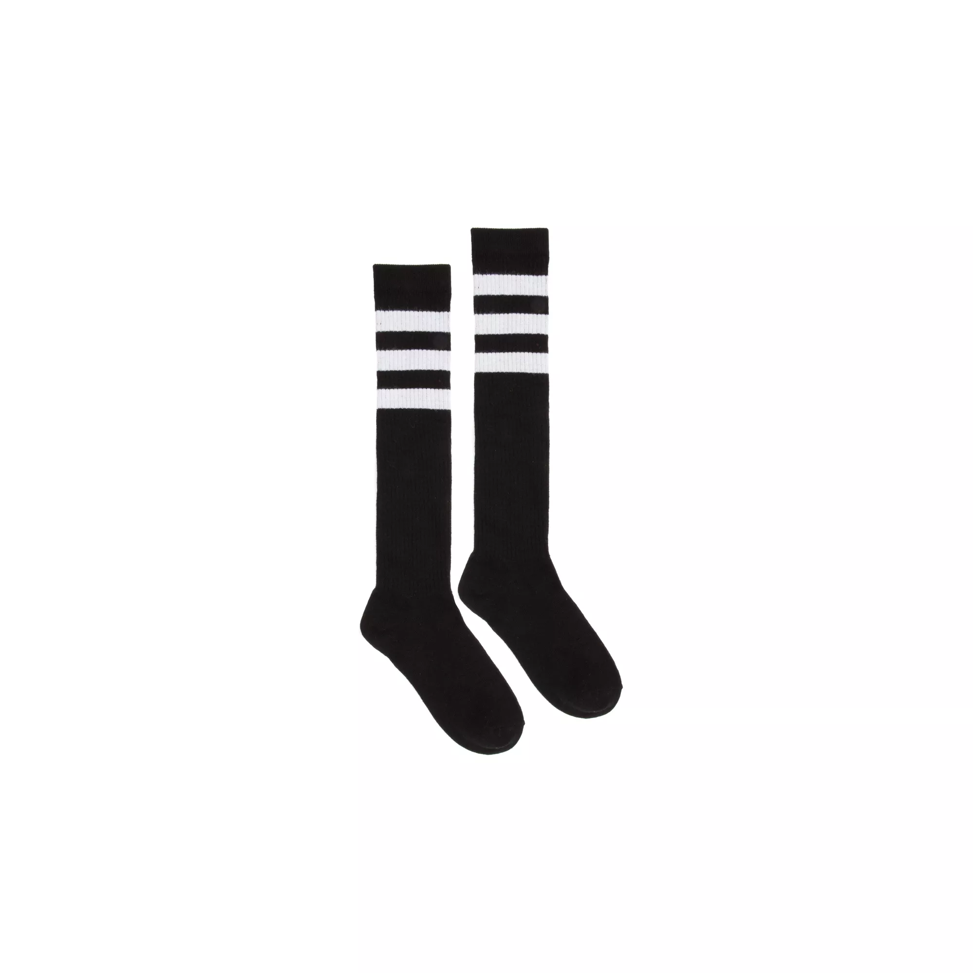 Your Halloween look will be set when you wear the Black with White Stripe Knee High Socks. These black socks hit at the knee and feature 3 white stripes.