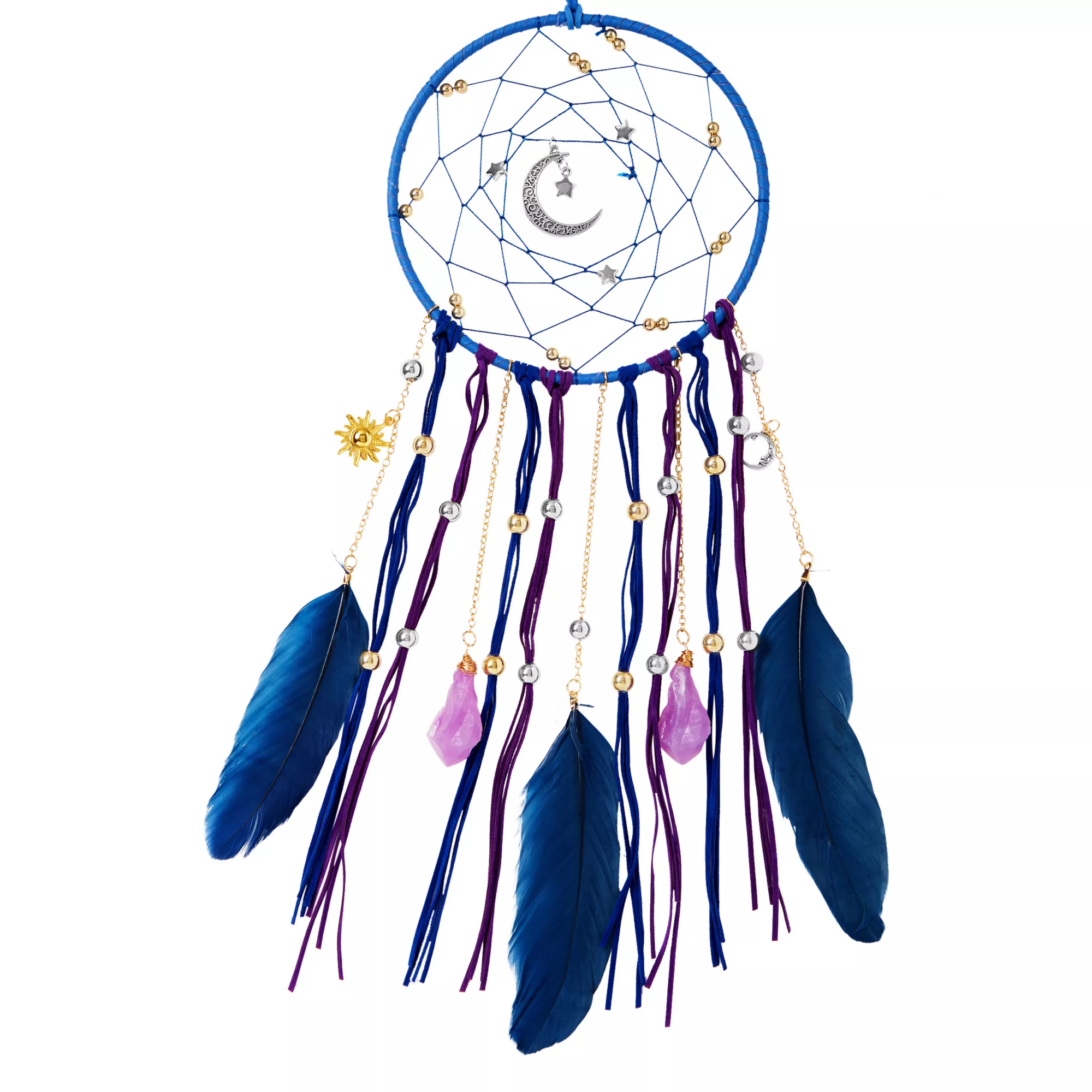 Protect your home with good vibes this Halloween when you hang up this Blue and Purple Dream Catcher! This dream catcher has a beautiful design that features sun and moon charms. Cleanse out the bad spirits with ease!