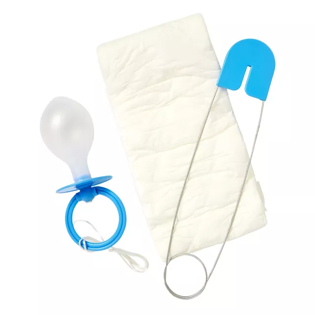 Set. Complete with giant diaper, pin, and pacifier, this set of funny
