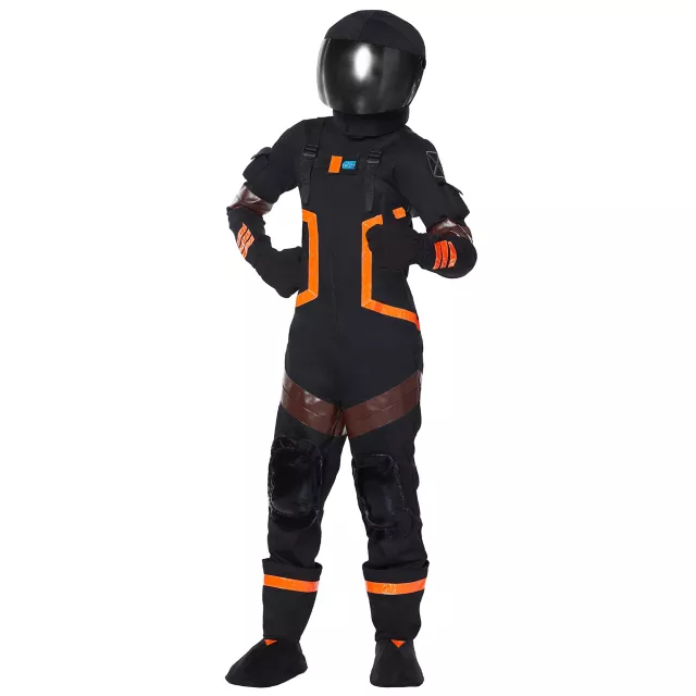 Strap up your helmet and get ready to rocket ride this Halloween with our officially licensed boys Fortnite Dark Voyager costume. With this epic must-have, you’ll be ready to conquer Tilted Towers with ease and bring home the win for the squad. Featuring the Dark Voyager’s iconic jumpsuit with reflective trim, plus an attached harness, gloves, knee pads, boot covers, and helmet with attached visor that flips up and down for your convenience, this costume comes with everything you need to become this legendary space explorer.