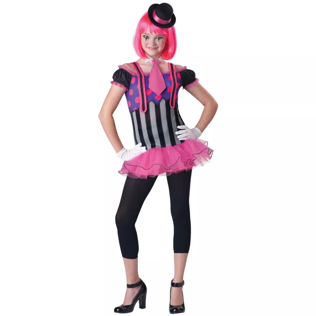 Runaway with the circus for a night in this Cabaret Clown Child Costume complete with striped and polka dot suspender tutu dress, white collar with attached pink bow tie and black bowler hat with hot pink ribbon detail. Hope you have an act planned!