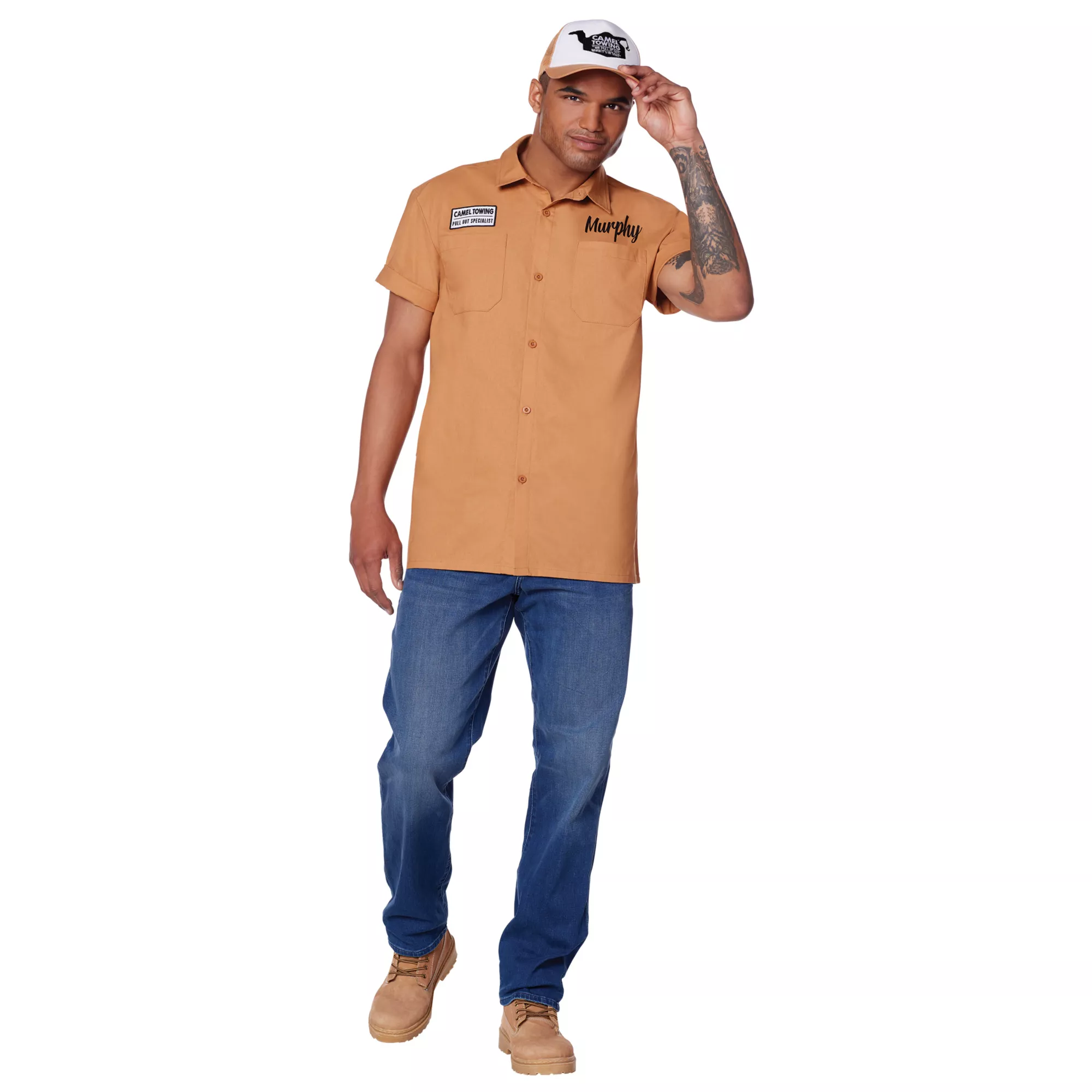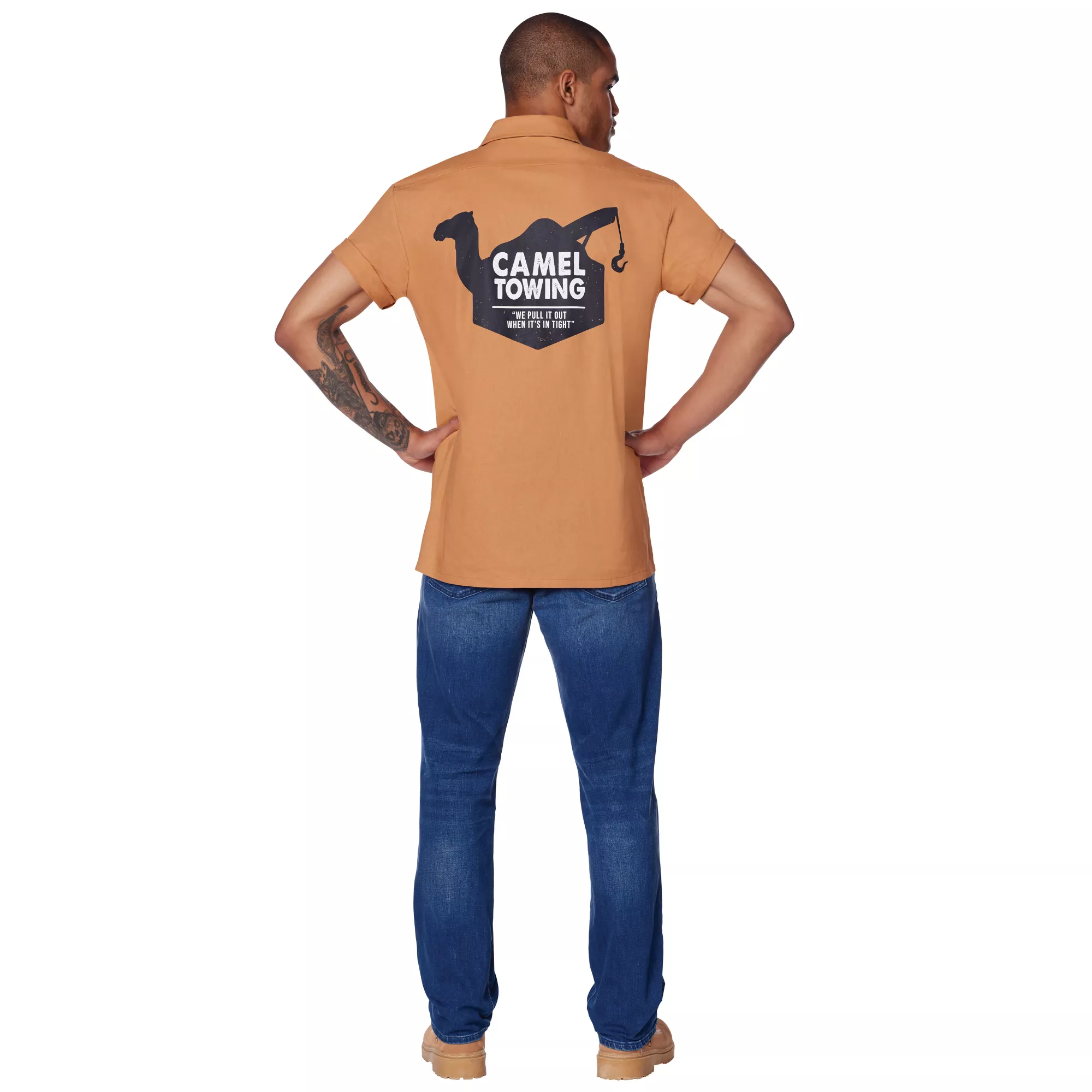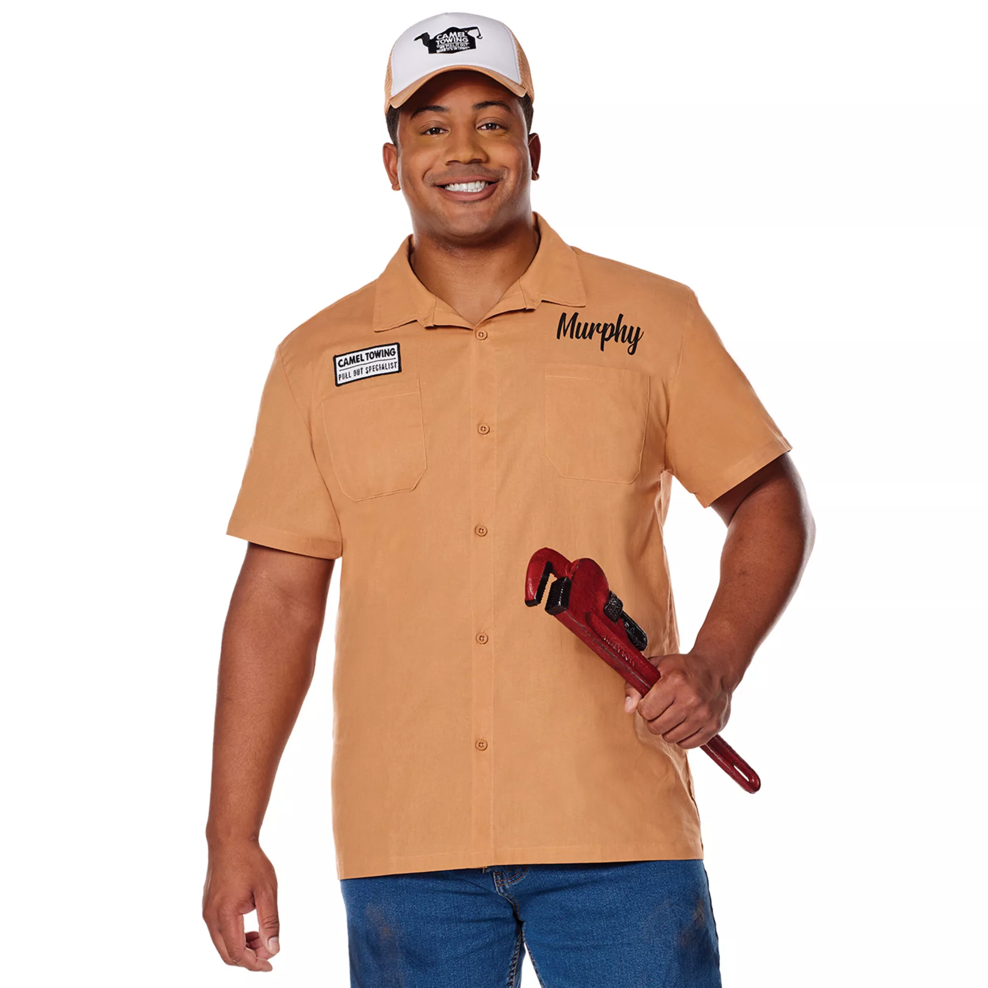 Go for all the humor with this Camel Towing Work Shirt! This easy funny costume is all you need to make it a hilarious Halloween. This brown work shirt says "Camel Towing Pull Out Specialist" on the front opposite the name "Murphy" and on the back has an image of a camel and a tow with the line "We pull it out when it's in tight." They won't be able to stop laughing!