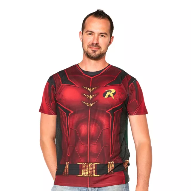 America's favorite sidekick is back in the Officially Licensed Robin Caped Costume T-Shirt. If you want to roll as Robin this Halloween, rock this red t-shirt with armor muscle detail, yellow belt, green "R" emblem and black flowing cape.