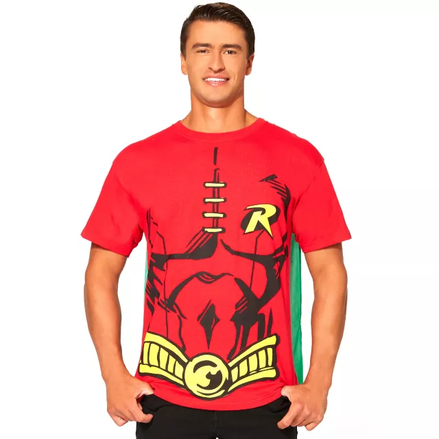 Assist the Caped Crusader on Halloween or whenever your city is in need of a hero with this officially licensed Batman Robin Adult Men's Caped T-Shirt. This 100% cotton tee features Robin character graphics and a superhero-worthy black cape.