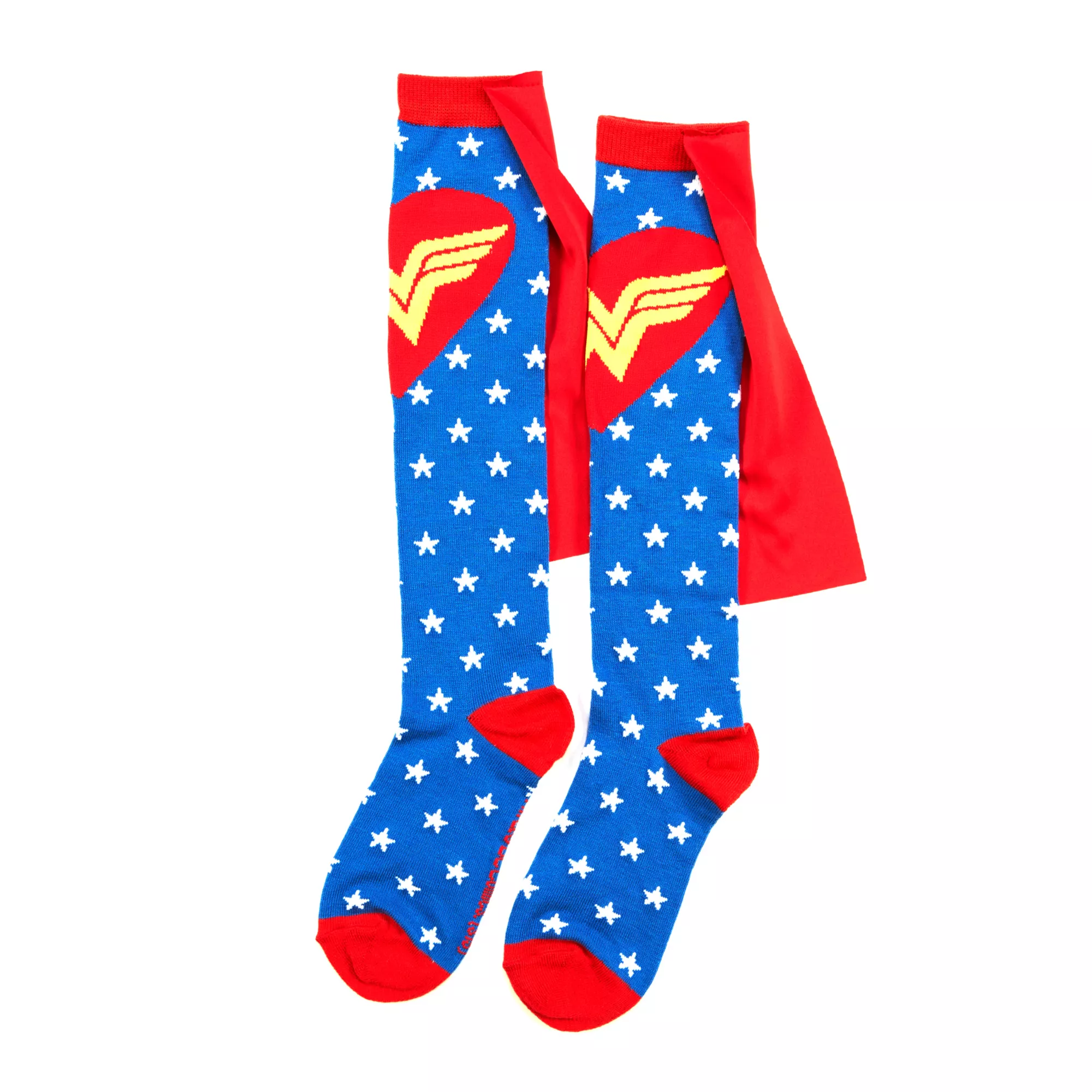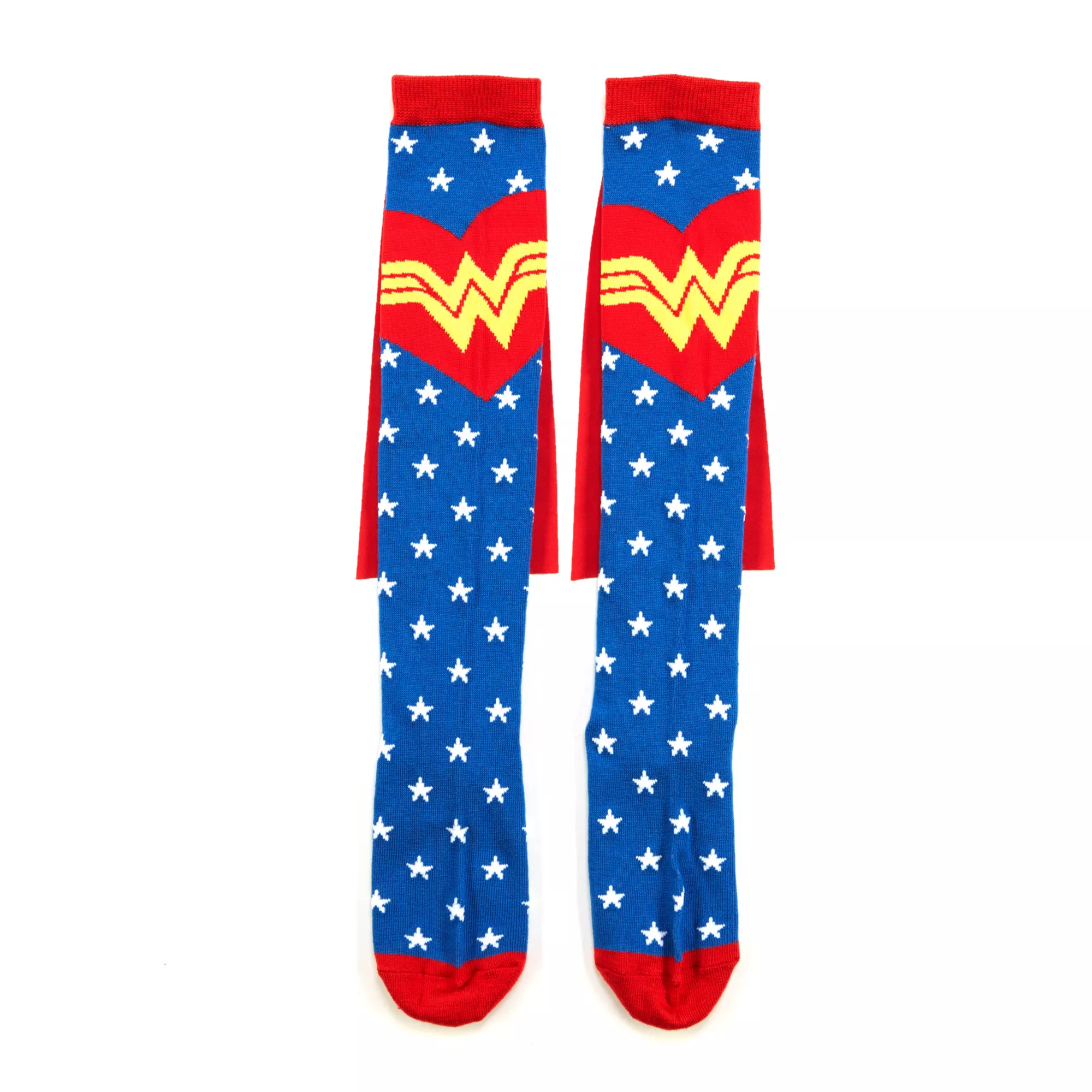 You're sure to look fly in these officially licensed Wonder Woman Star Fashion Caped Socks! These awesome socks are a bright blue with white stars and red accents, as well as a red heart with the Wonder Woman logo. The red cape attached at the top will set these socks apart as super!