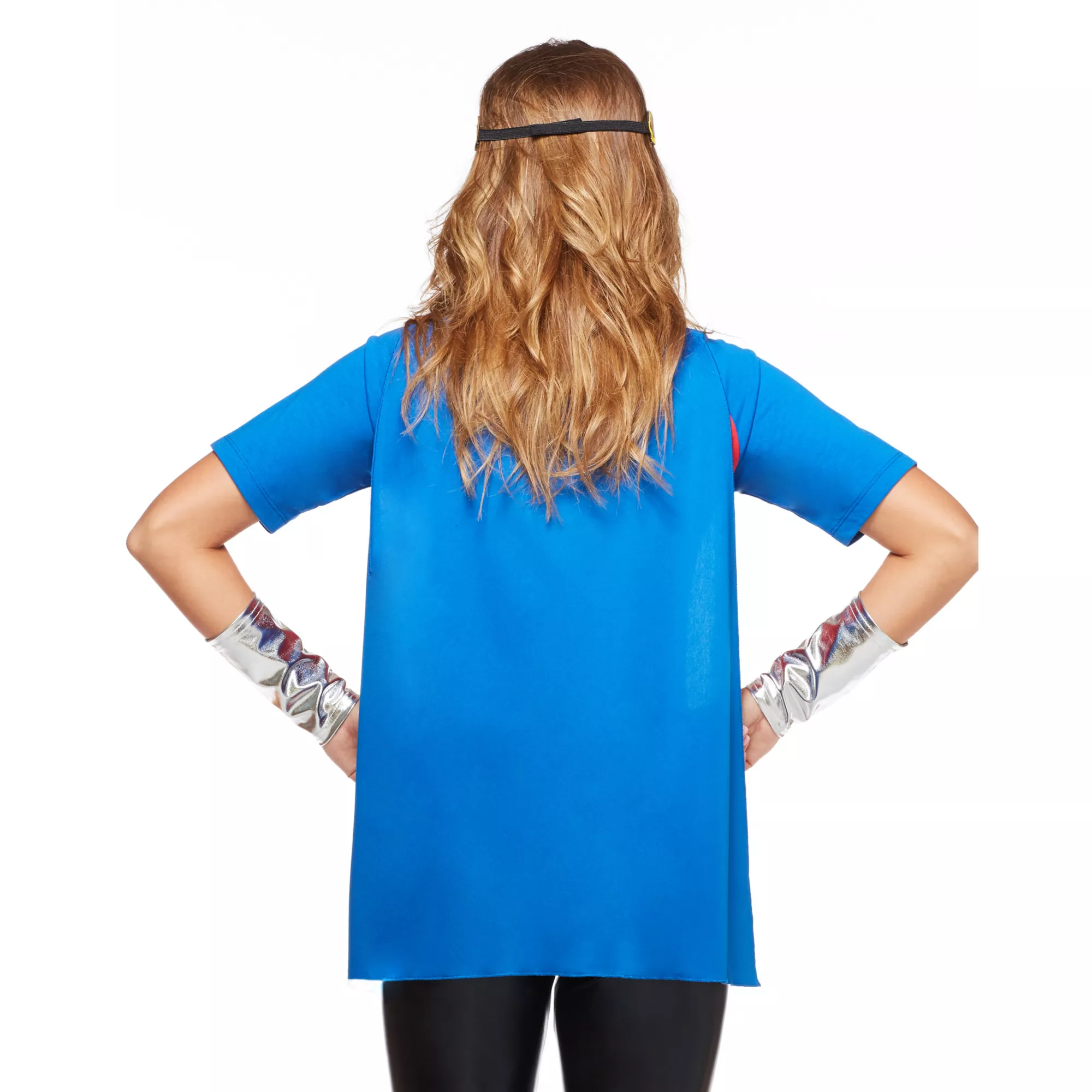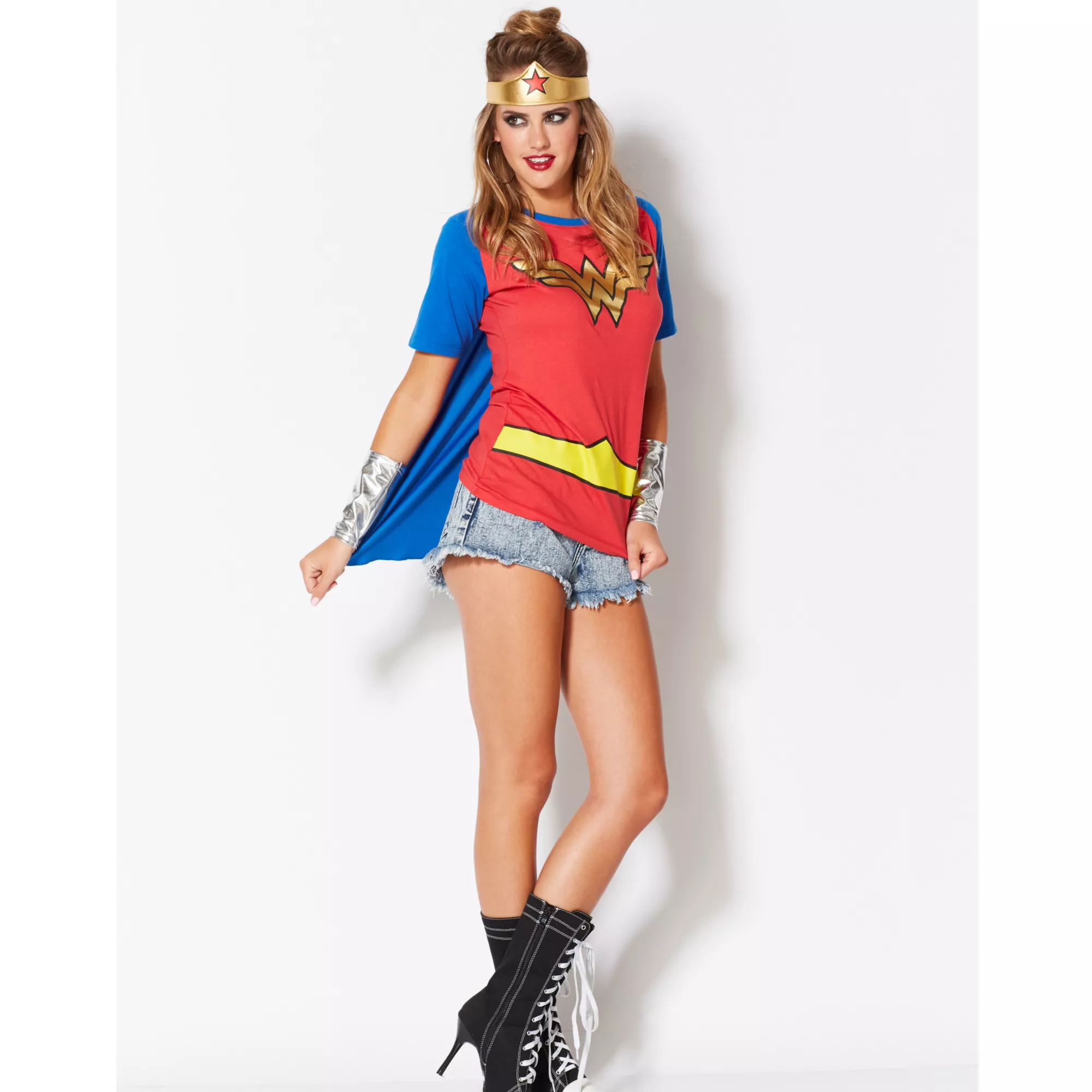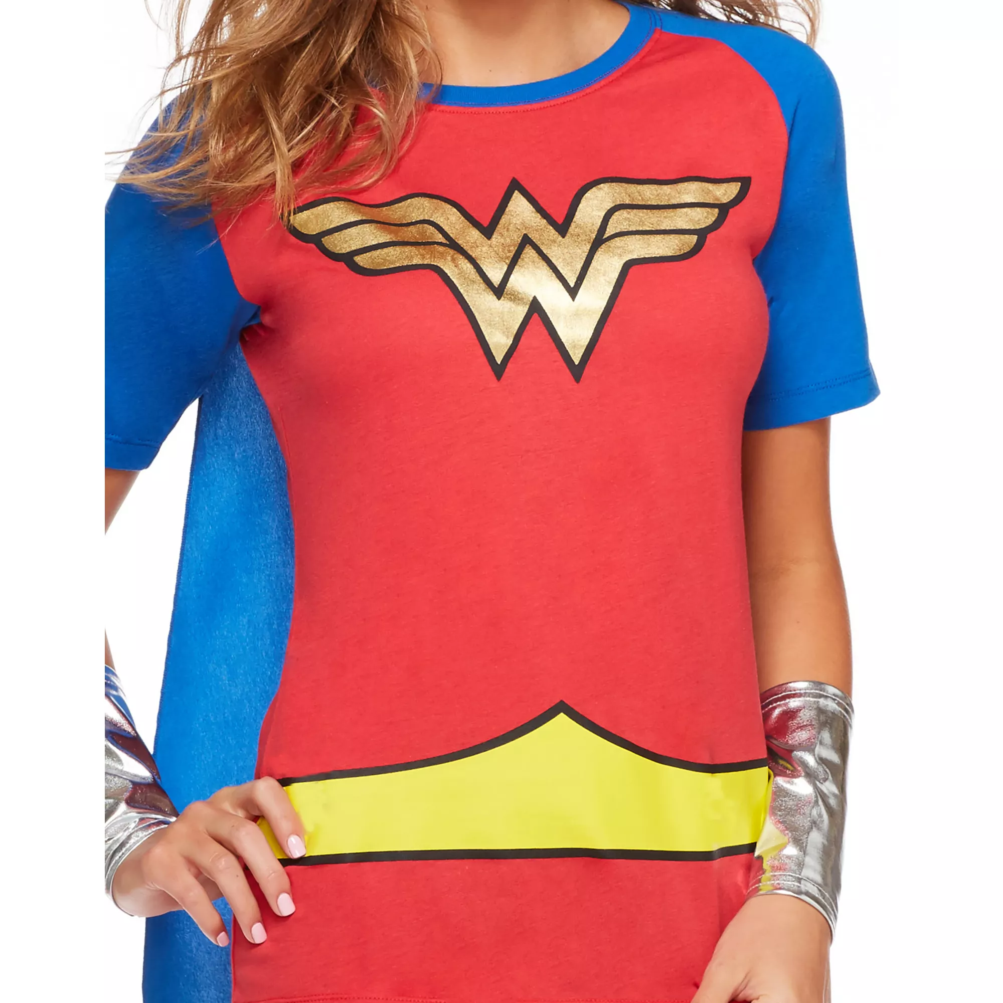 Save the day in style when you wear this officially licensed Wonder Woman Caped T-Shirt. The red tee features gold Wonder Woman emblem on the chest along with a yellow screen printed belt and blue bottom hem with white stars.