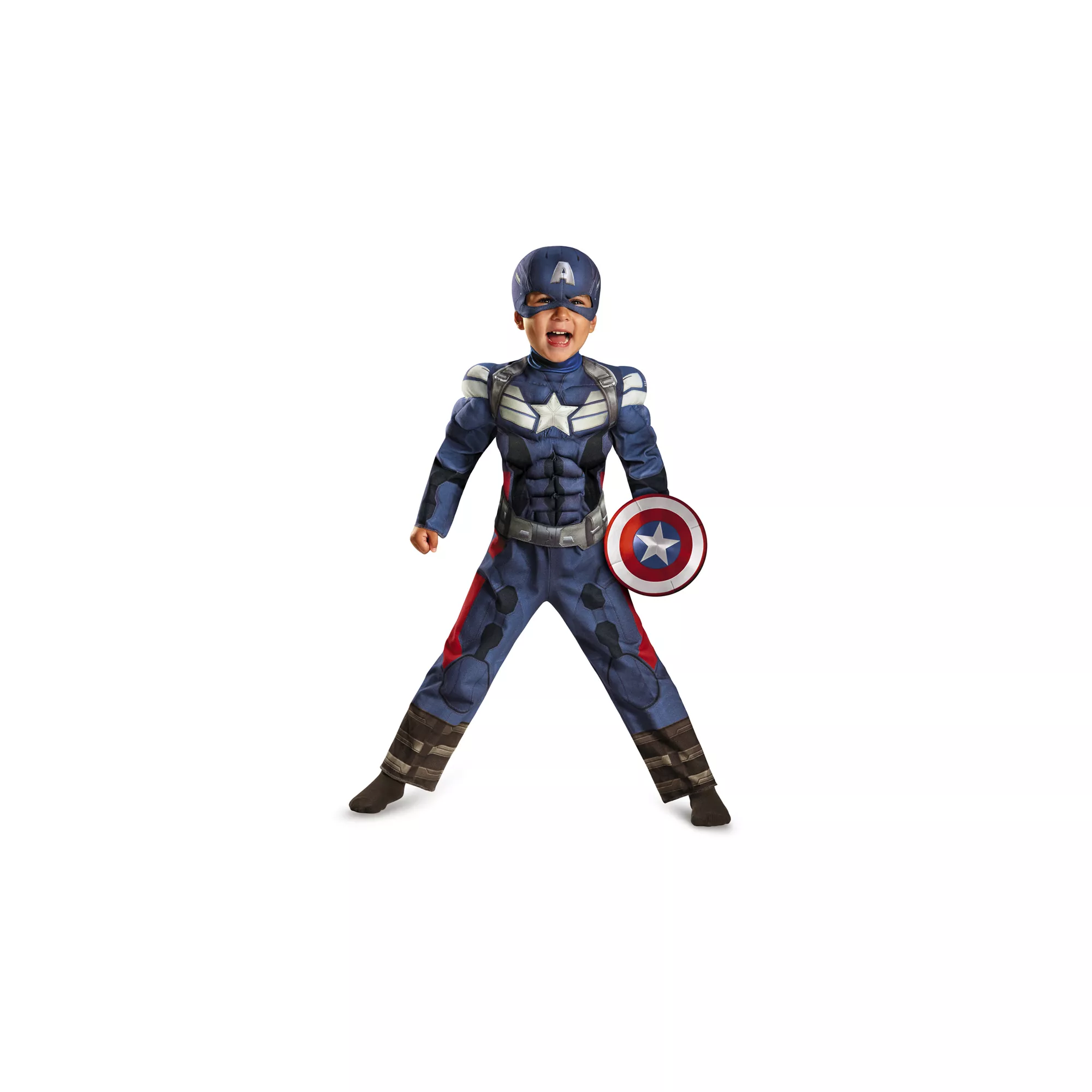Your little one will be the ultimate super solider in the Officially Licensed Captain America Toddler Muscle Costume. Take on all the bad guys in this blue, red and silver muscled jumpsuit with mask-style headpiece. Add the Captain America shield (sold separately) to be at maximum superhero strength.