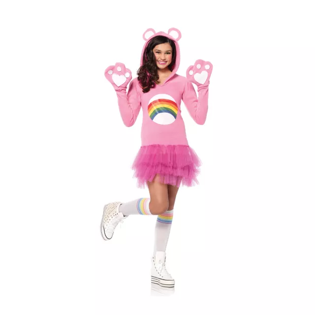 Spread some heart-warming cheer this Halloween in the Officially Licensed Care Bear Cheer Bear Teen Costume. Your perkiness will be evident in this pretty pink hooded dress with attached ears, tail and paw gloves. Also features Cheer Bear's rainbow Belly Badge and a cute ruffled skirt.