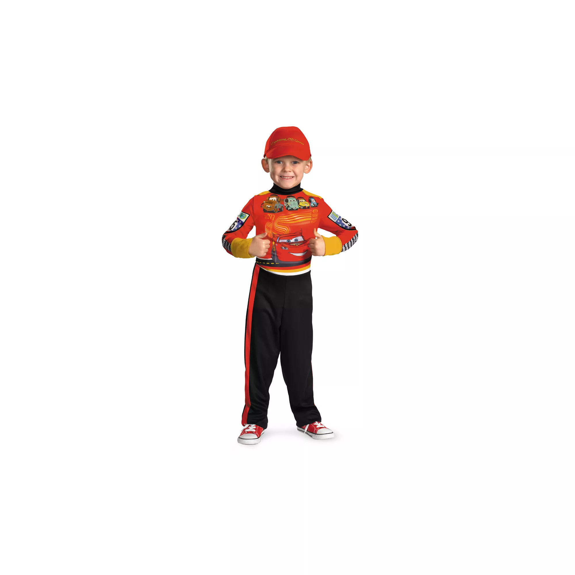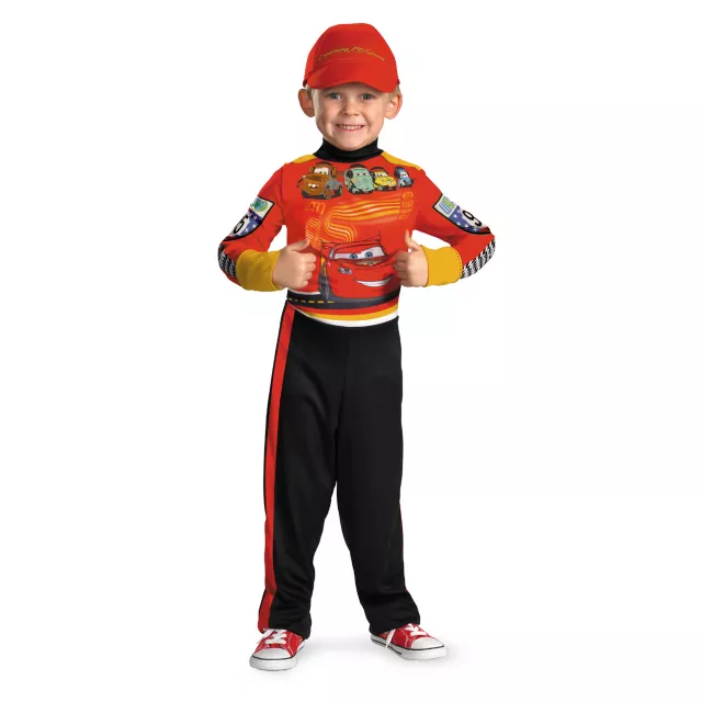 Get on the fast track for a fun Halloween in this officially licensed Disney Cars 2 Lightning McQueen classic child costume. The red, yellow and black, 100% polyester jumpsuit comes complete with a matching red cap.