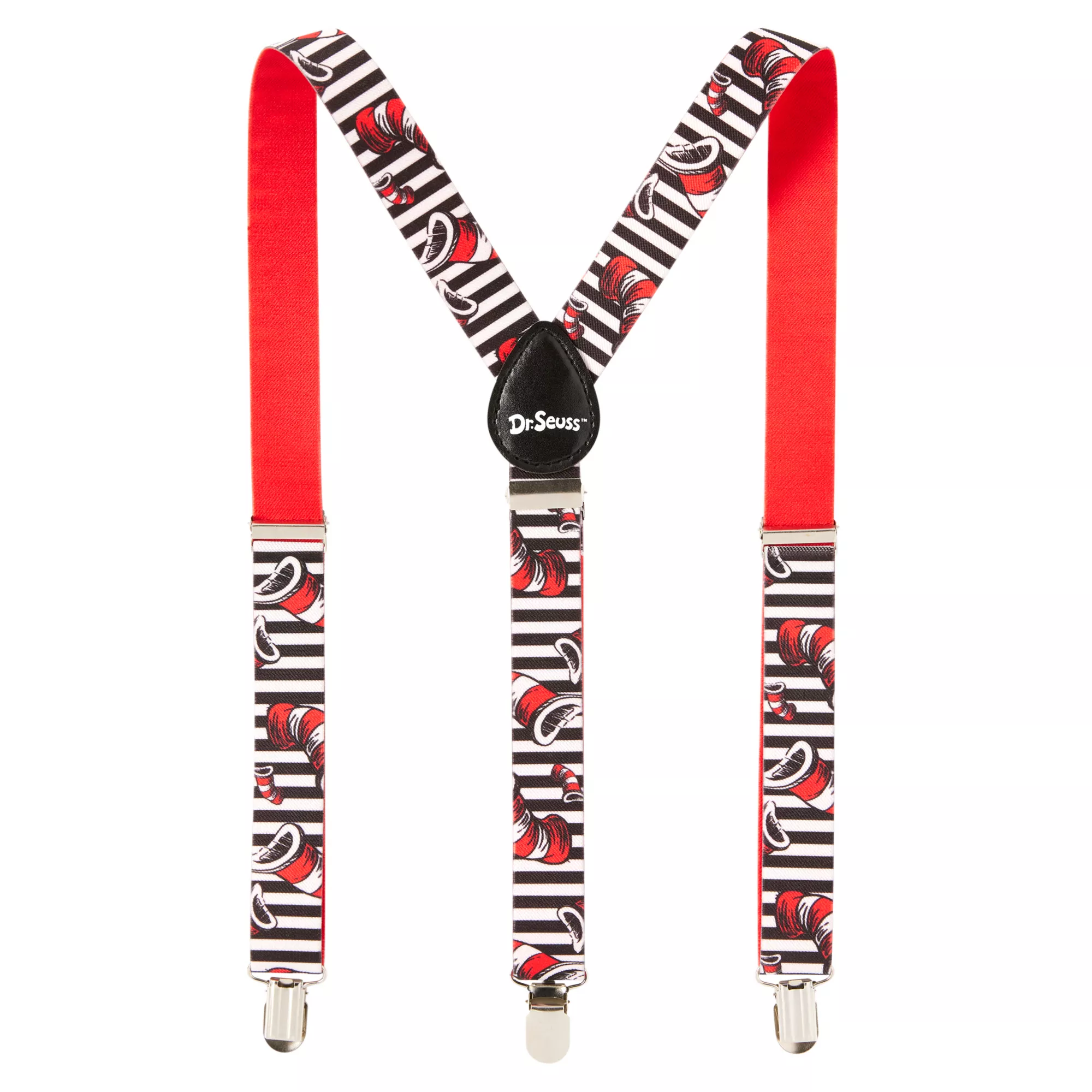 Suit up in Dr. Seuss’s style with these officially licensed suspenders and pins! Everyone is sure to know which storybook is your favorite when they see you in these black and white striped suspenders which are accented all over with the Cat in the Hat’s iconic red and white top hat. Add the included pins to the ensemble to complete the look!