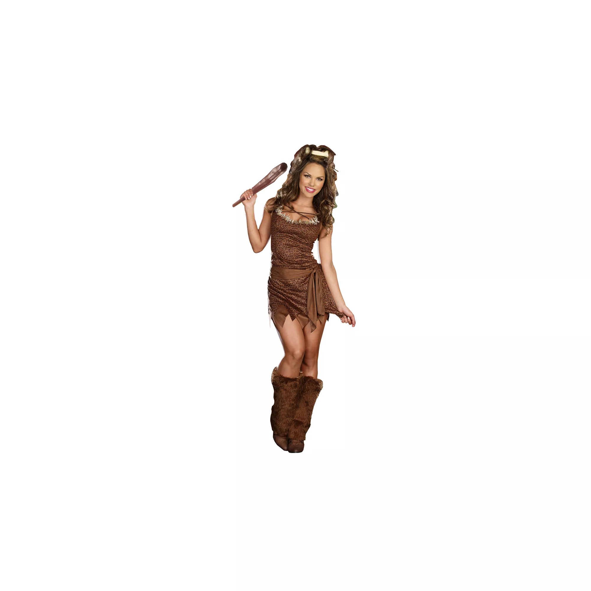Go Prehistoric when you don the Cavewoman costume and transform yourself from a gatherer to a hunter. The brown animal print dress of this Prehistoric costume features a jagged hem and comes complete with a matching belt, bone-inspired headpiece and faux fur boot covers.