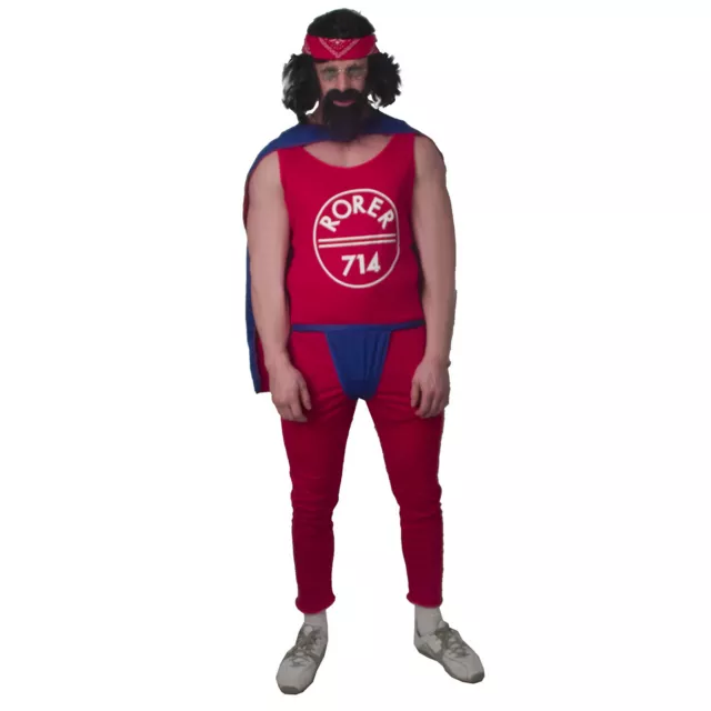 Spark up and rock out when you decide to wear this officially licensed Cheech and Chong Chong Rocker adult costume. The red jumpsuit comes complete with a red and blue cape, matching pants and a red bandana.