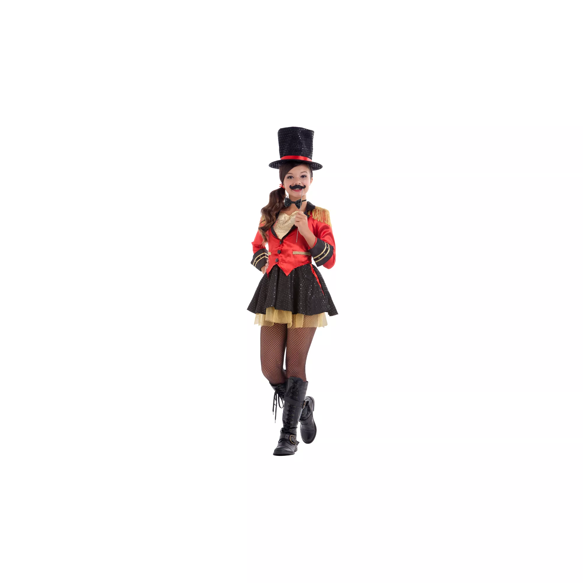 Be the star of the show in the Circus Darling Child Costume. This black dress has a sequined skirt, red, satiny jacket with elaborate gold shoulder detail, black bow tie, and ring leader top hat. Lead the lions and dazzle brighter than the tight-ropers in this costume.
