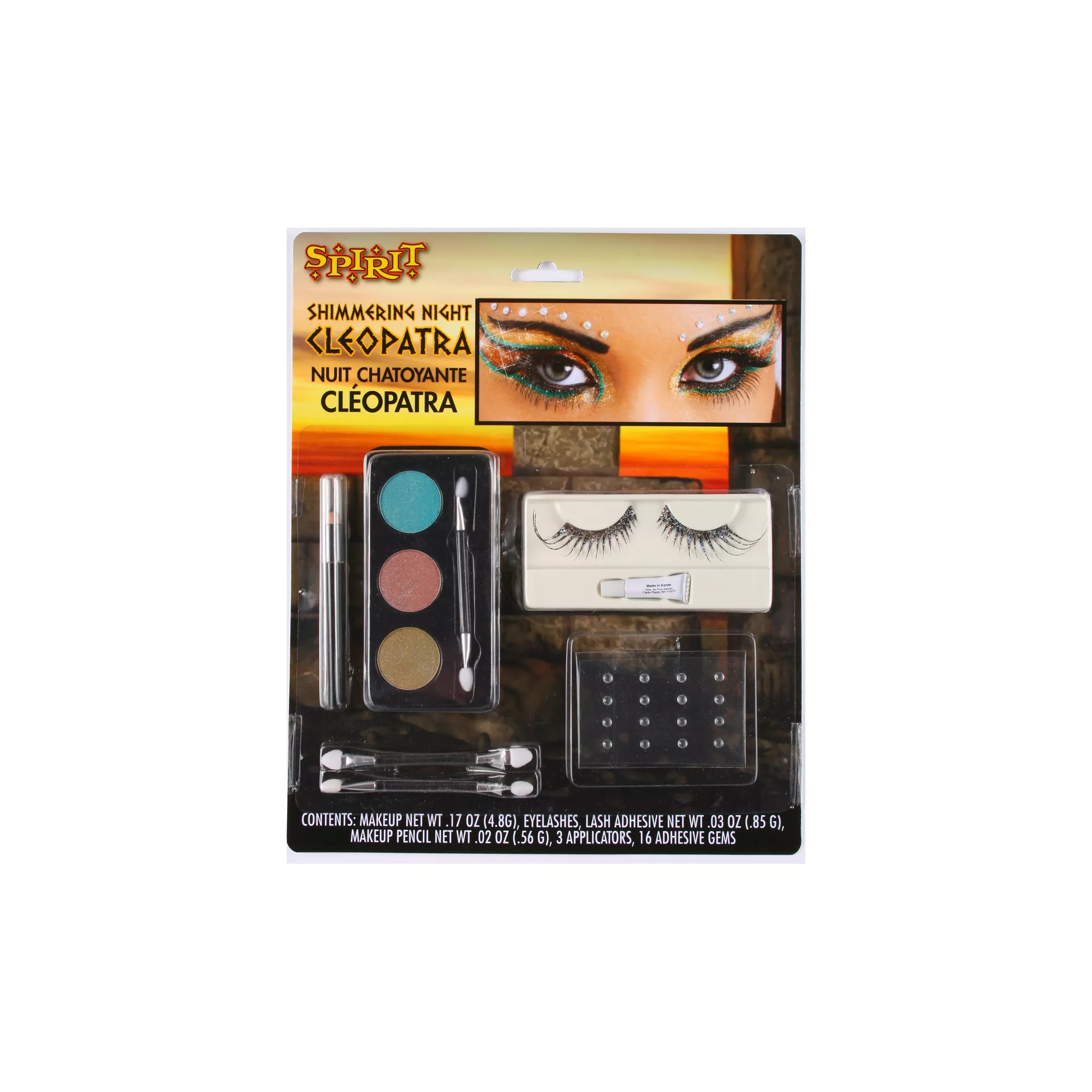 Finish your royal look with the help of this Cleopatra Makeup Kit. Bring out the sparkle in your eyes using this glittery eyeshadow palette with teal, pink, and gold colors, black liner, fake elongated lashes, brushes and glue.