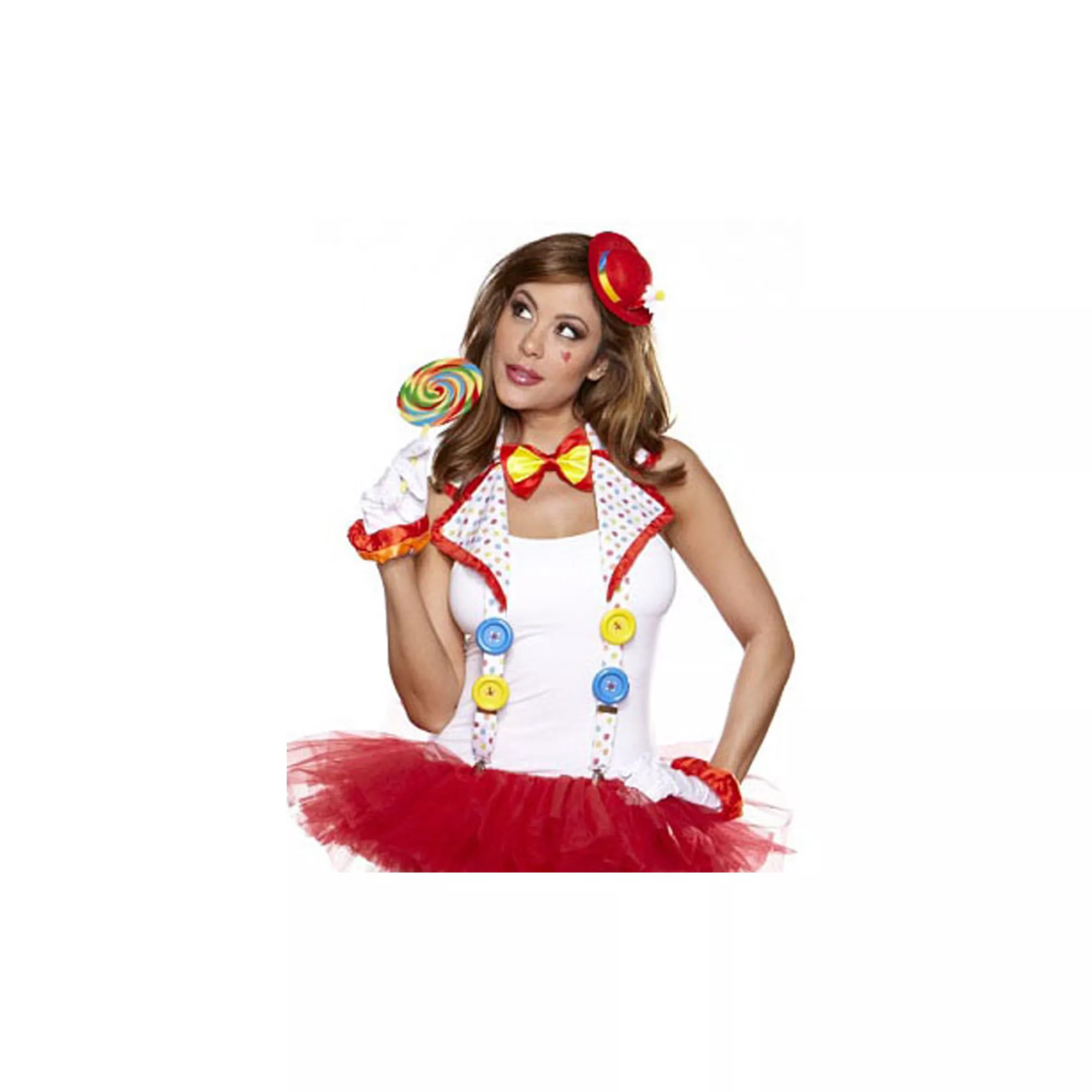 Get to clowning around on Halloween when you dress up using the Girl Clown Suspender Kit. This colorful kit comes complete with a bright yellow and red bowtie and polka dot suspenders with fun button details.
