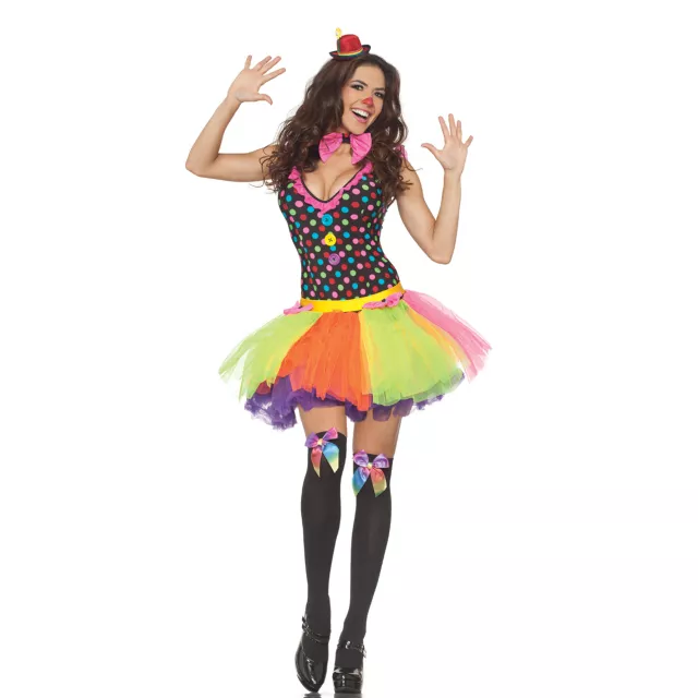 You won't be a laughing matter when you wear this Clowning Around adult womens costume. The black, spandex-topped dress with multicolor comes with a polyester net skirt along with a hot pink satin bow tie, stocking clips and a hat.
