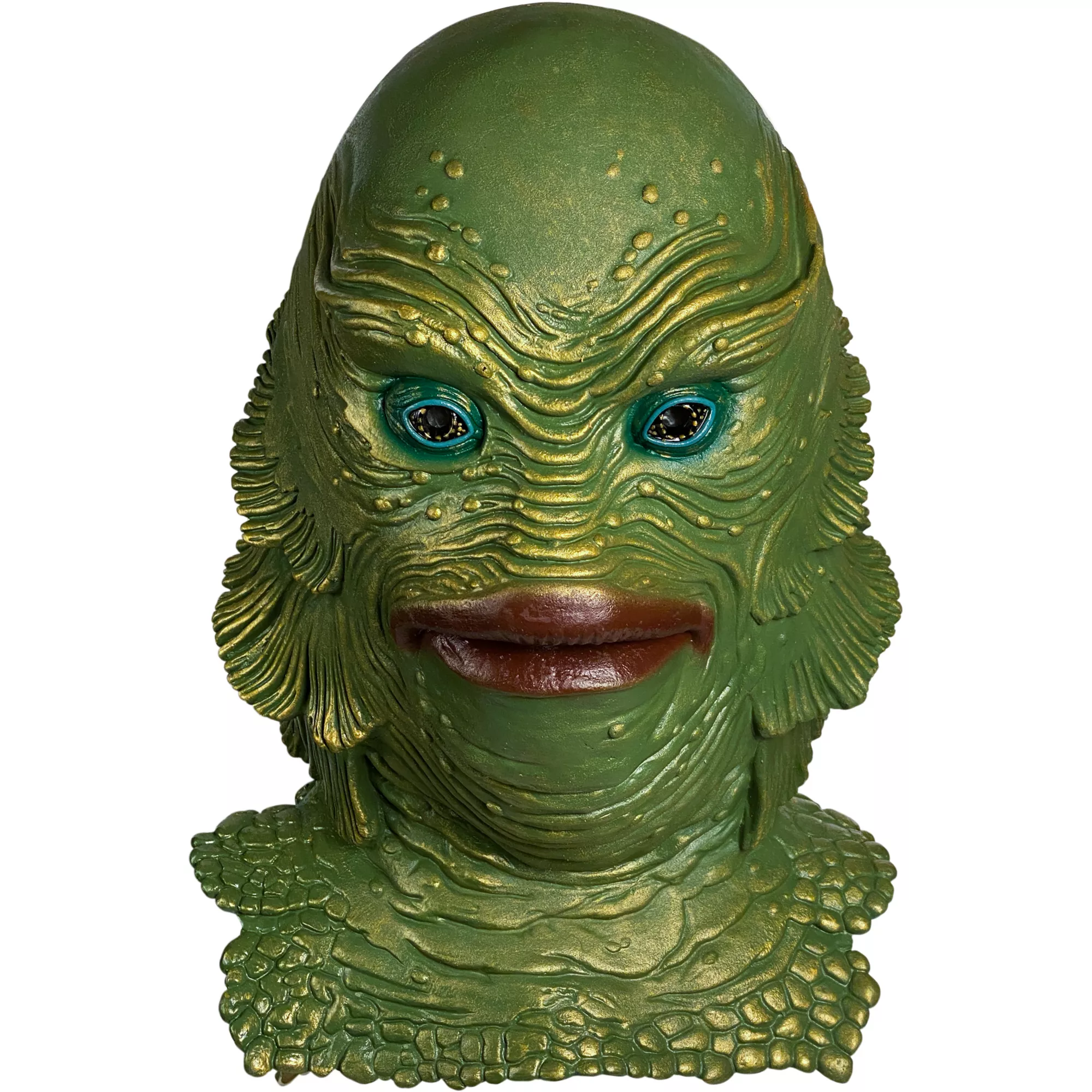 Take a dip in the horrifying world of the Creature from the Black Lagoon when you wear this full mask! This green mask covers your face and head, transforming you into a part-human, part-amphibian creature.