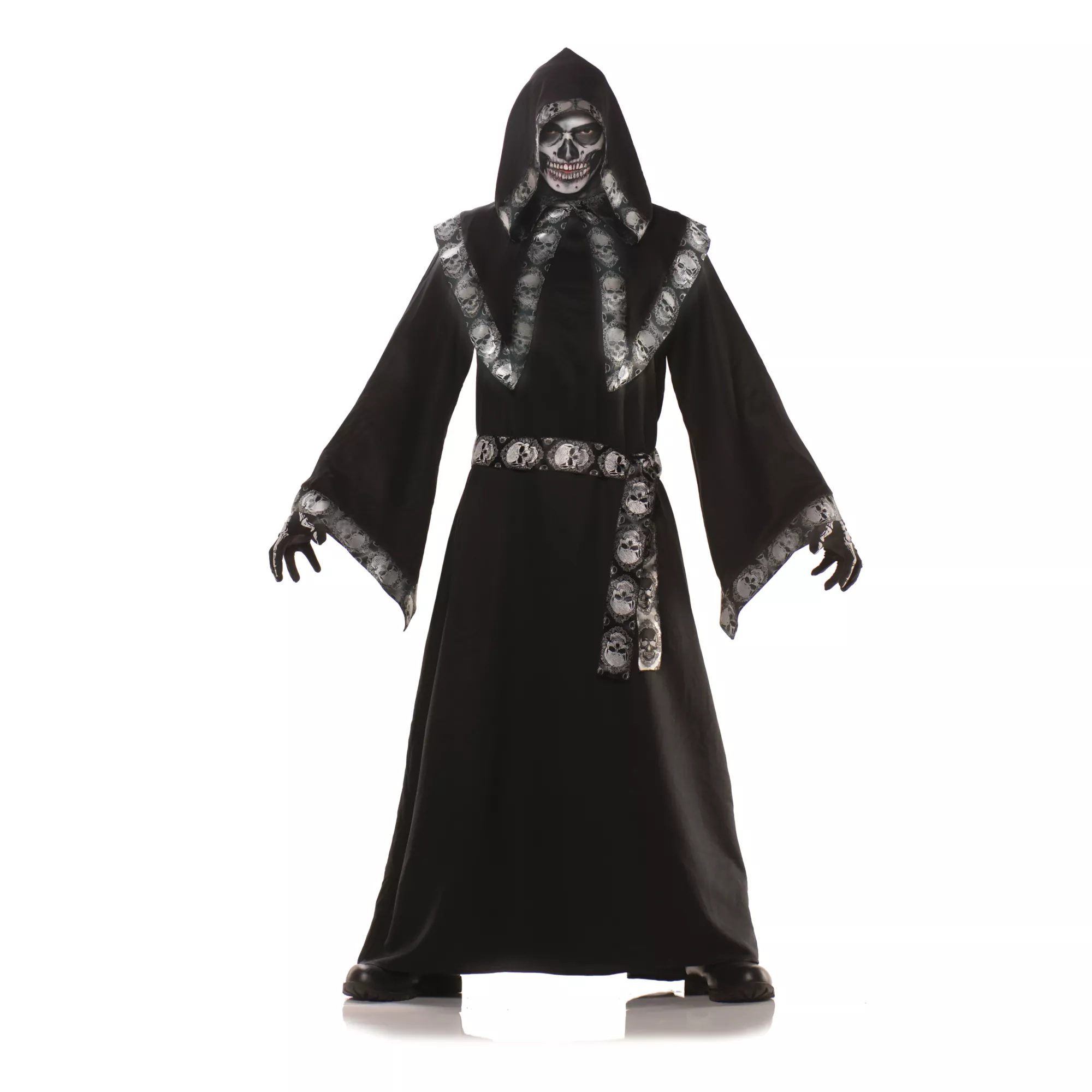 Beware this Halloween, the cemetery is left unguarded because the keeper is at the party wearing the Crypt Keeper Robe. Features a black robe with skull printed trim and attached matching shawl and hood. Also includes silver and black skull belt.
