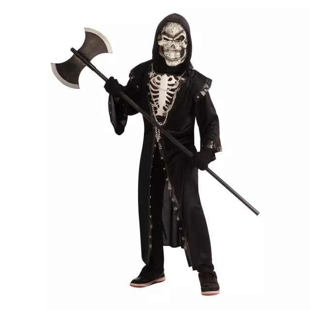 This reaper will make onlookers weep! Try to go easy on them wearing this Dark Reaper Child Costume. All Hallow's Eve may get a little grimmer when you're seen in this robe with grommets, chain trim, hood, and of course, skeletal mask giving you a deathly look.
