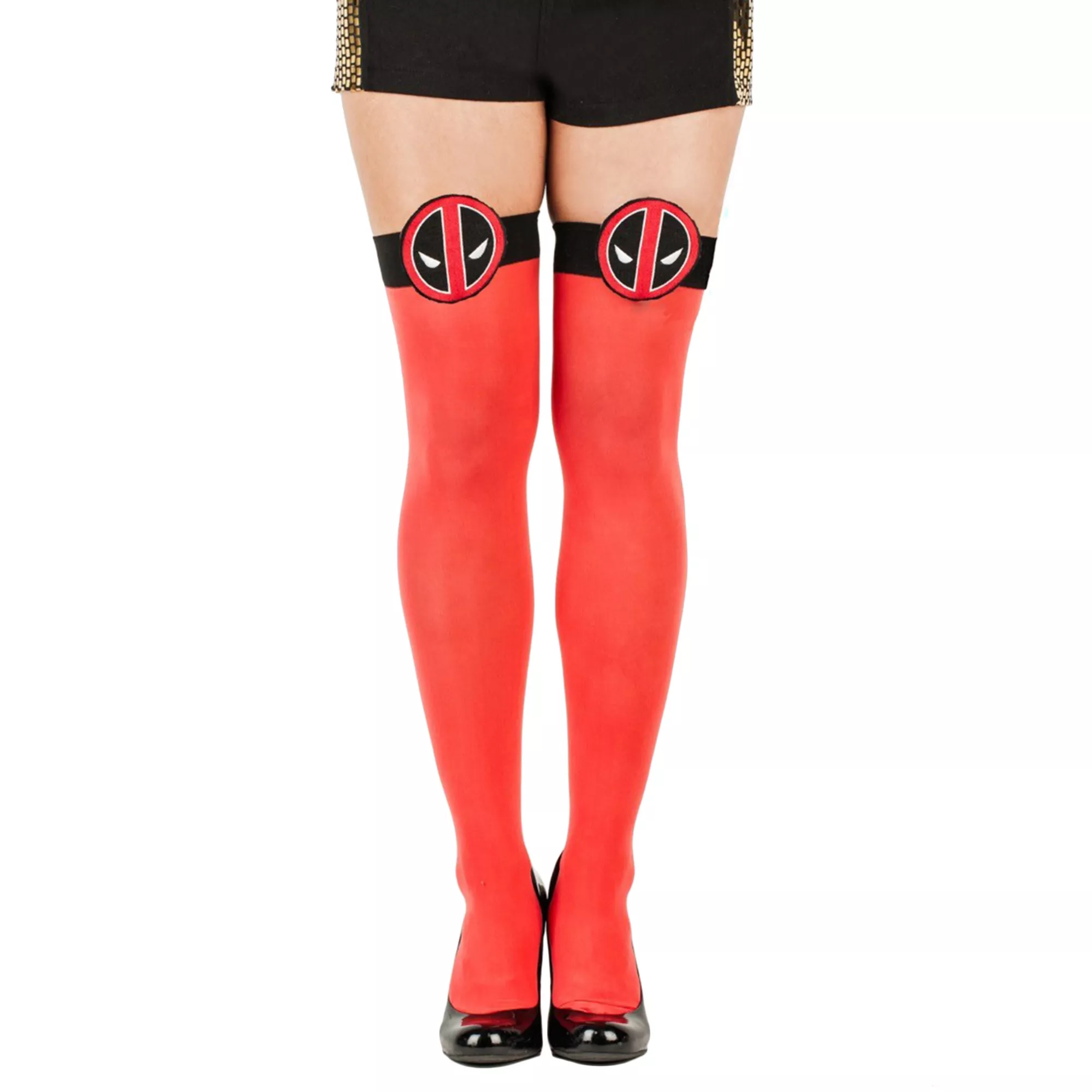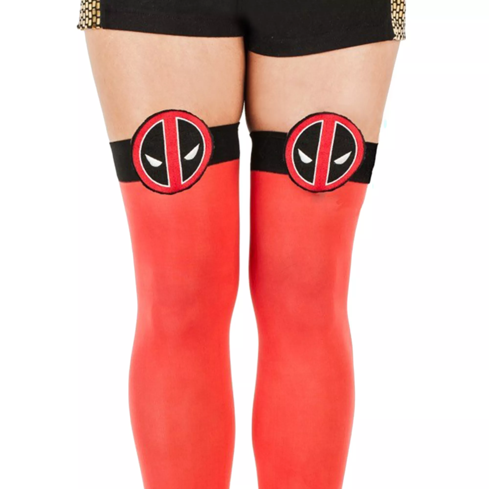 Rock the awesome mercenary look with these officially licensed knee highs! These socks feature Deadpool's signature red and black design and logo, making them awesome for any Deadpool-themed costume or outfit!