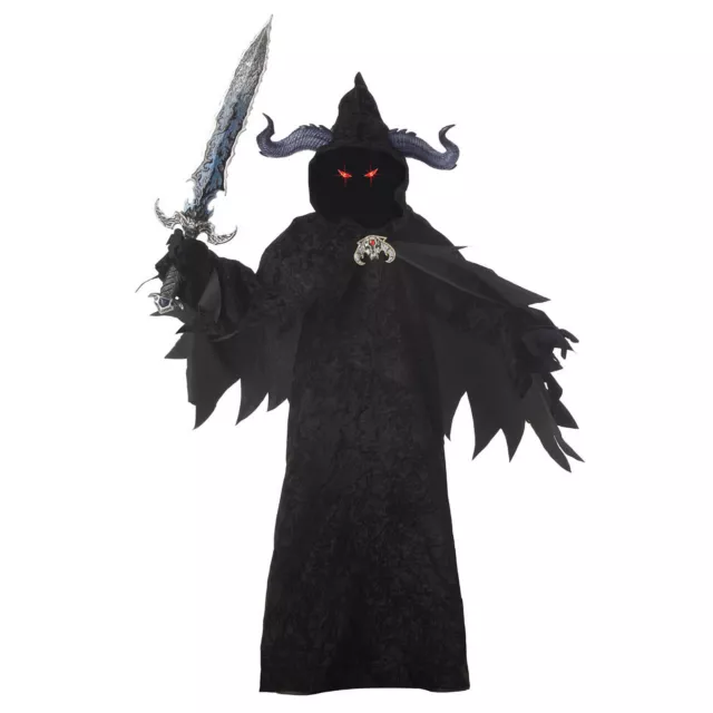 Thrive on evil and chaos this Halloween when you wear this Demon of War child costume. The black robe of this demon costume features a hood with face cover and LED light-up eyes, complete with a medallion and demon horns.