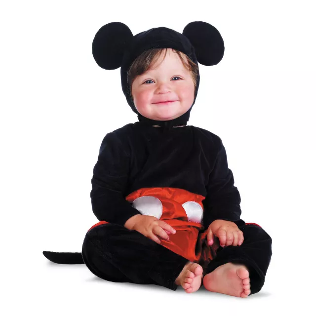 • The Disney Mickey Mouse Baby costume consists of a black, red and white character jumpsuit with a detachable tail and a matching character headpiece.