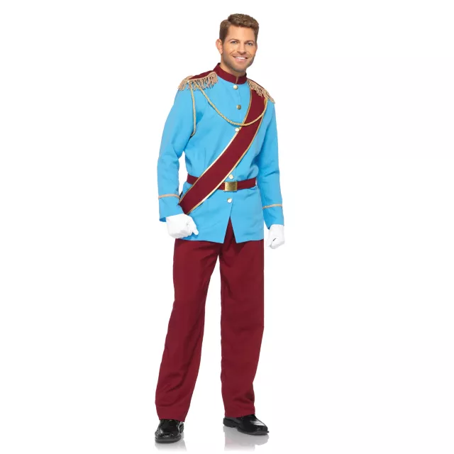 Only true love can wake the princess, so gather up all your love on Halloween when you wear the officially licensed Disney Prince Charming Adult Men's Costume. This light blue jacket features a red sash and comes complete with a belt and pants.
