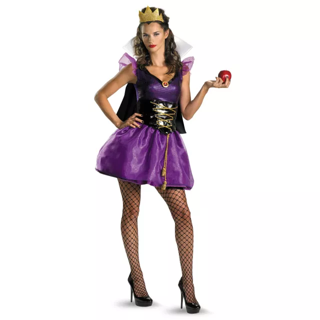 Look wickedly good on Halloween in this officially licensed Disney Sassy Evil Queen adult womens costume. Dance the night away or curse them all while wearing the black and purple dress, complete with black corset, capelet, petticoat and a crown.