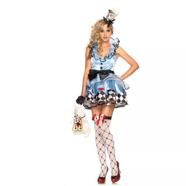 You hold all the cards when you arrive at the party on time or fashionably late in this Diva Alice adult womens costume. The 100% polyester, blue dress features red, black and white playing card-inspired details along with a satiny black bow sash.