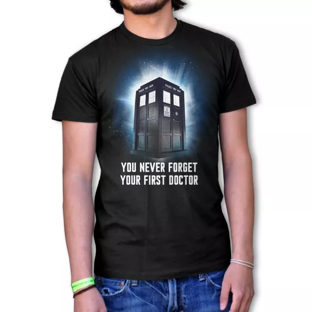 Travel through time and space wearing this Doctor Who Adult T-Shirt so everyone knows just who you are! The 100% cotton T-Shirt features the print "You Never Forget Your First Doctor".