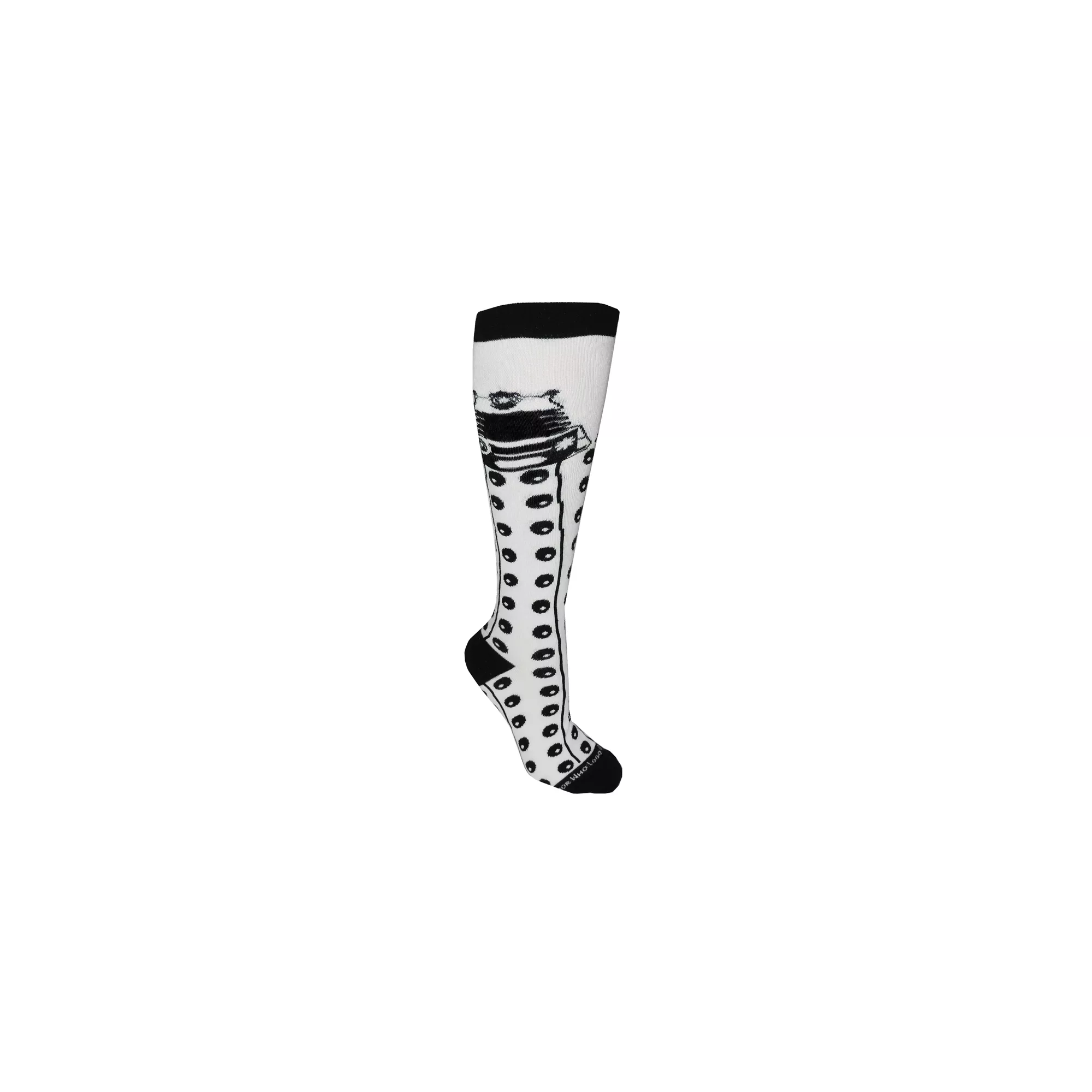 Explore all lands in style in the Officially Licensed Doctor Who Dalek Knee High Socks. These black and white socks feature a Dalek design.