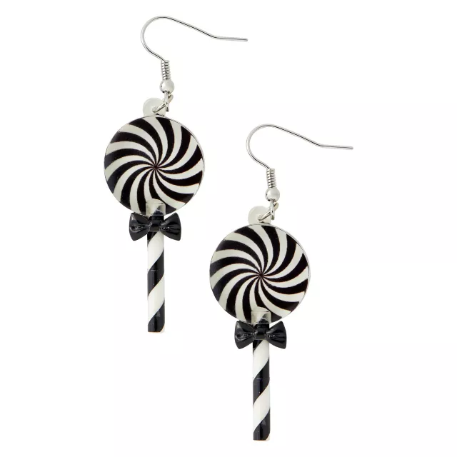 Add a sweet touch to your Halloween costume or any outfit with these doll lollipop earrings! These fun earrings feature black and white swirled lollipops and are a fun accessory any time of the year.