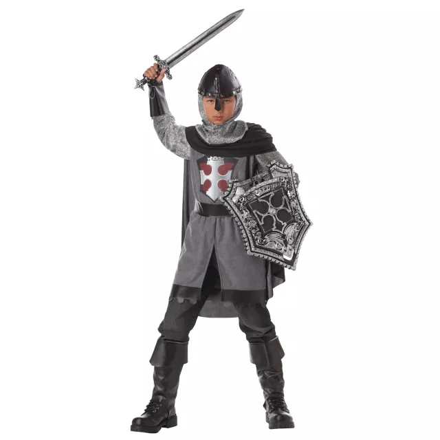 Go forth to save the damsel in distress or find the nearest Dragon when you wear this Dragon Slayer boys costume. The black and gray tunic of this knight costume features red heraldic print and comes complete with a matching cape, a hood, belt, gauntlets and black boot covers.