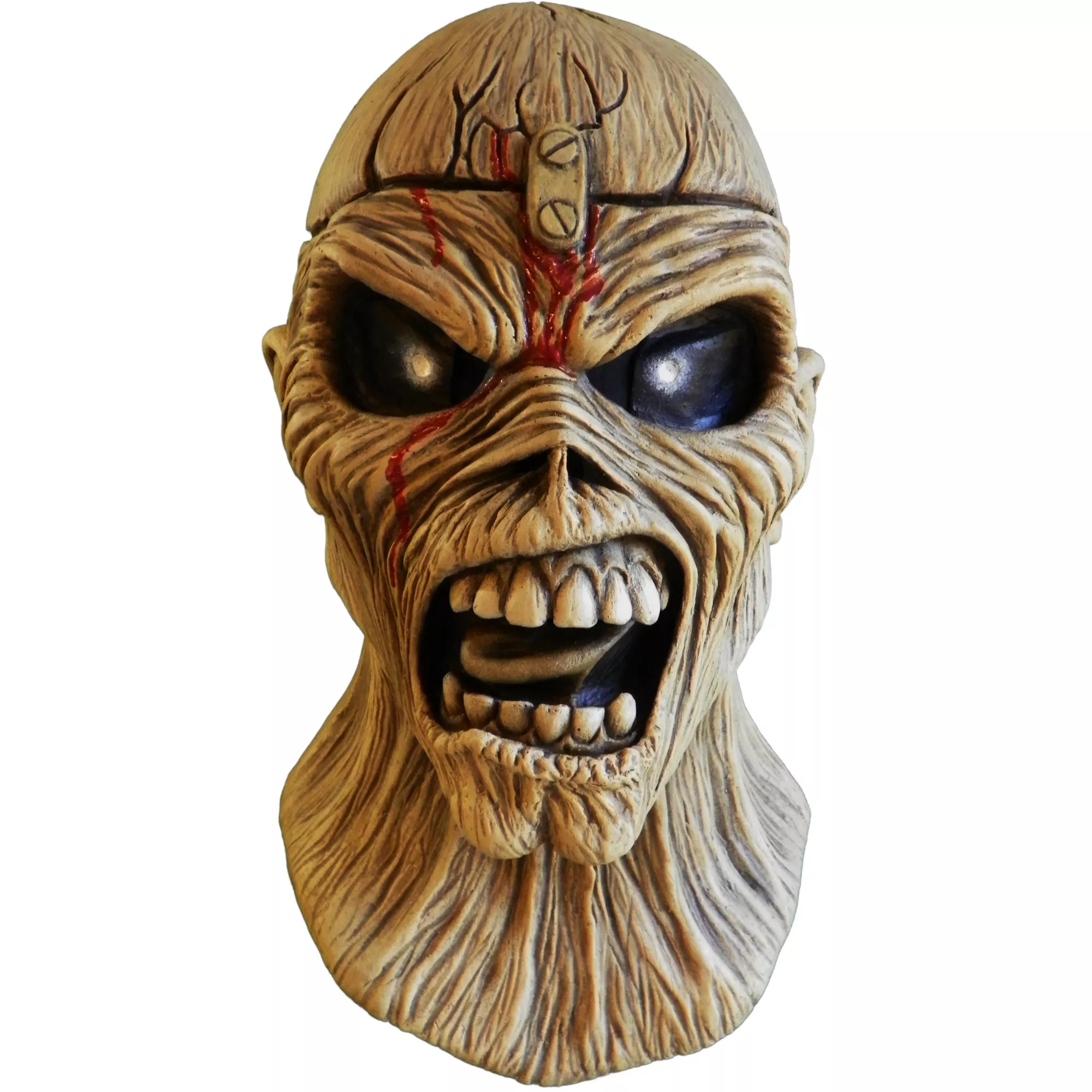 You'll look like a heavy metal rock star in this Eddie mask! This full mask features fleshtone skin with a fake blood drip and an awful, twisted scowl. Join the Iron Maiden crew with this authentic Eddie the Head mask!