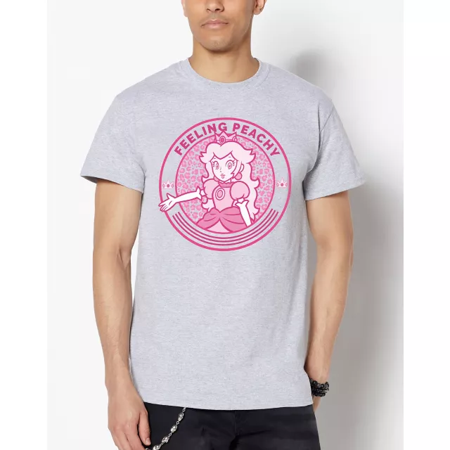 Add this Princess Peach graphic tee to your wardrobe if she's your favorite character! You'll be feeling peachy when you slip into this gray graphic tee with a cheery Princess Peach graphic.