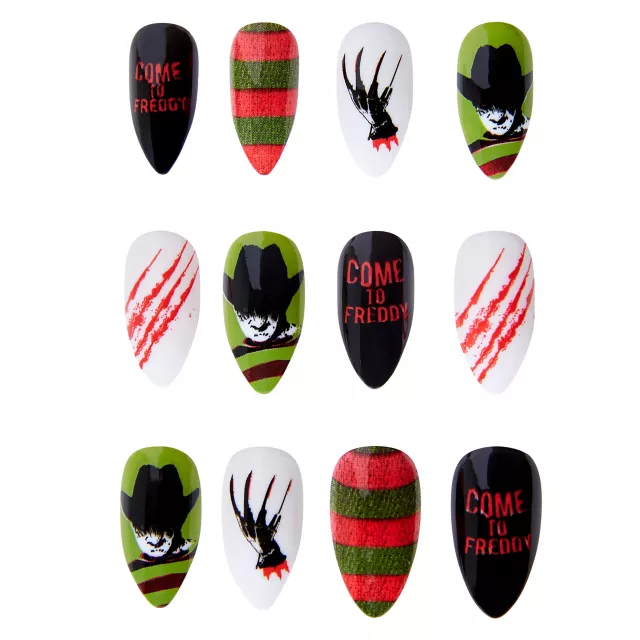 Show off your favorite horror movie with these official A Nightmare on Elm Street Freddy Krueger press on nails! These faux nails feature Freddy Krueger as well as his familiar colors. They're perfect to go with your horror costume (sold separately) or just to add some fun to your fingertips.