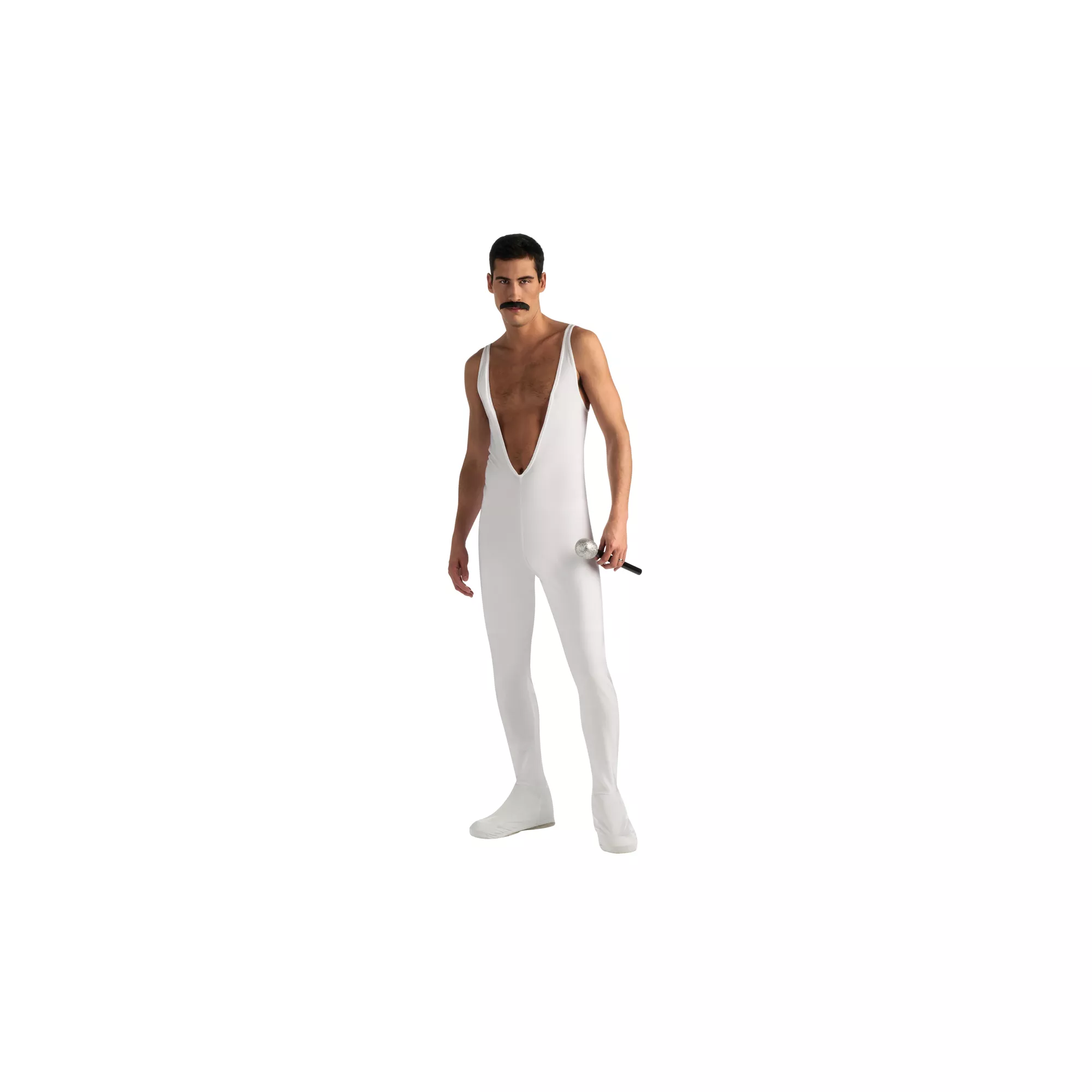 You are the champion when you don this officially licensed Freddy Mercury white jumpsuit adult mens costume. Wear it and belt out your favorite Queen hits or sing along and party on Halloween.